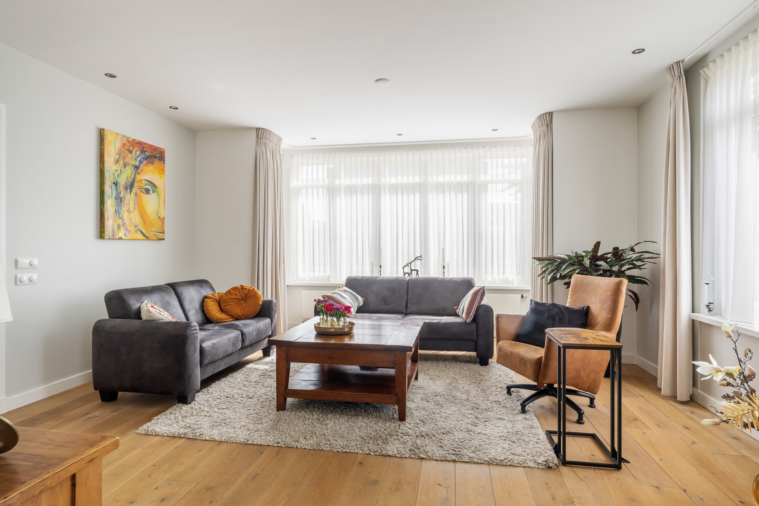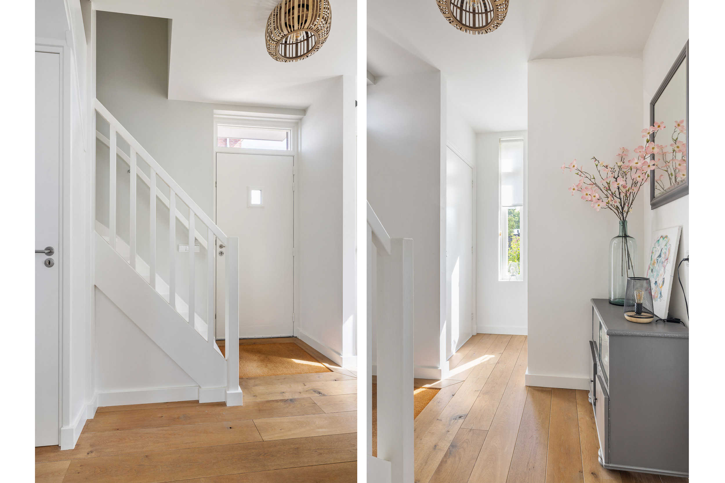 De royale hal verwelkomt je in dezelfde warme stijl. Hier begint de fraaie eikenhouten vloer, die naadloos doorloopt tot in de keuken. De strak gestucte wanden en het plafond met inbouwspots geven een luxe uitstraling.