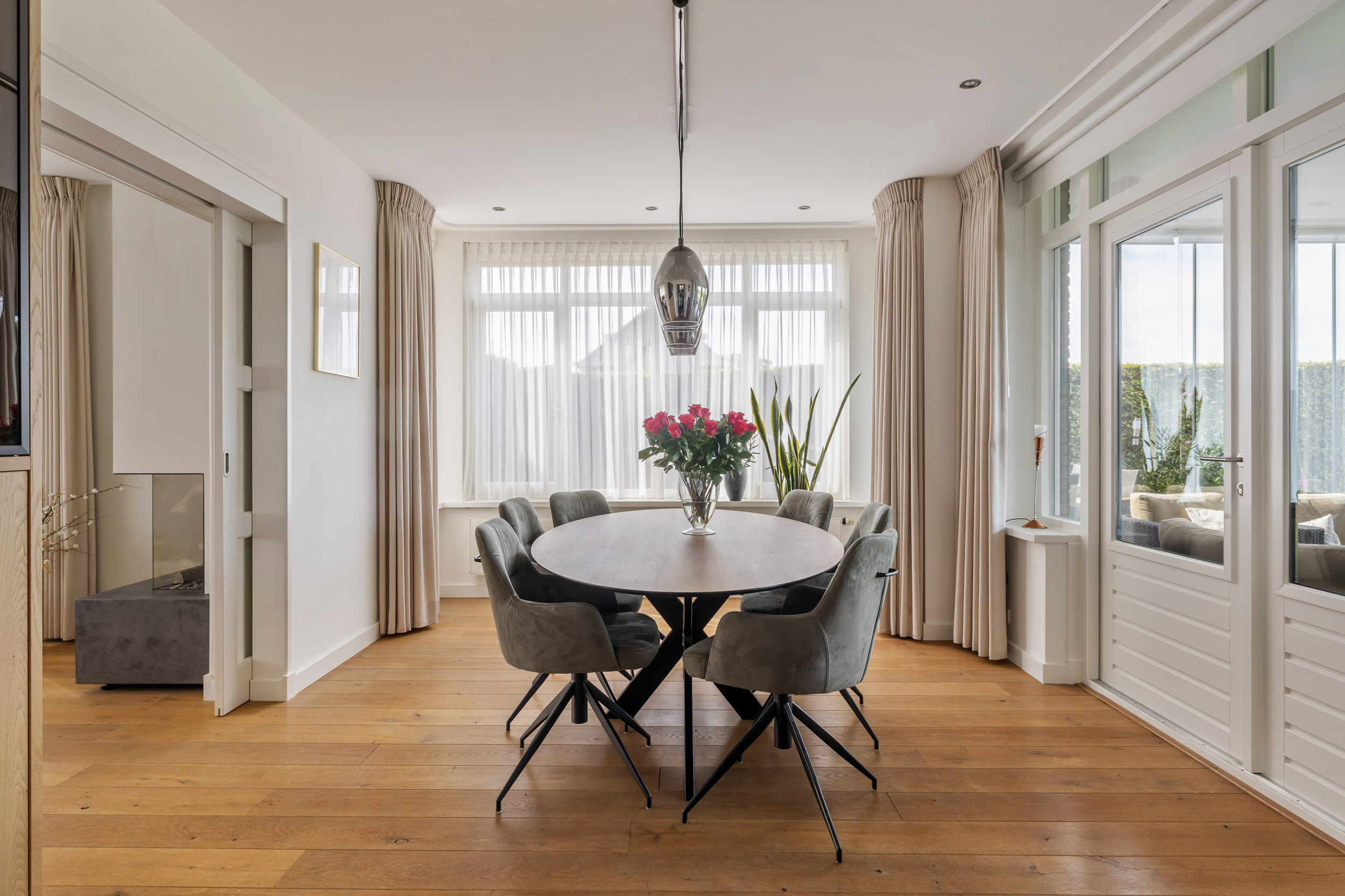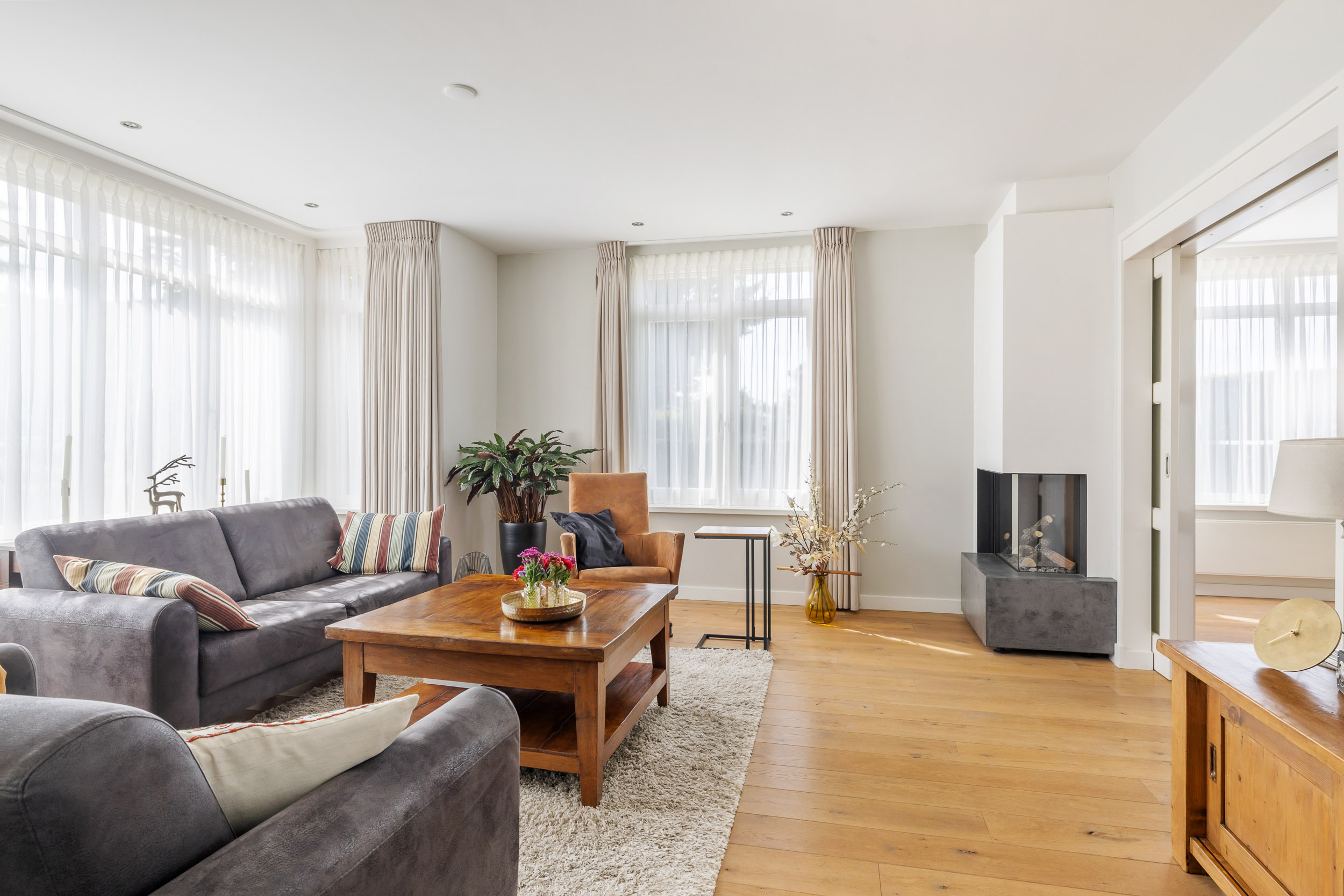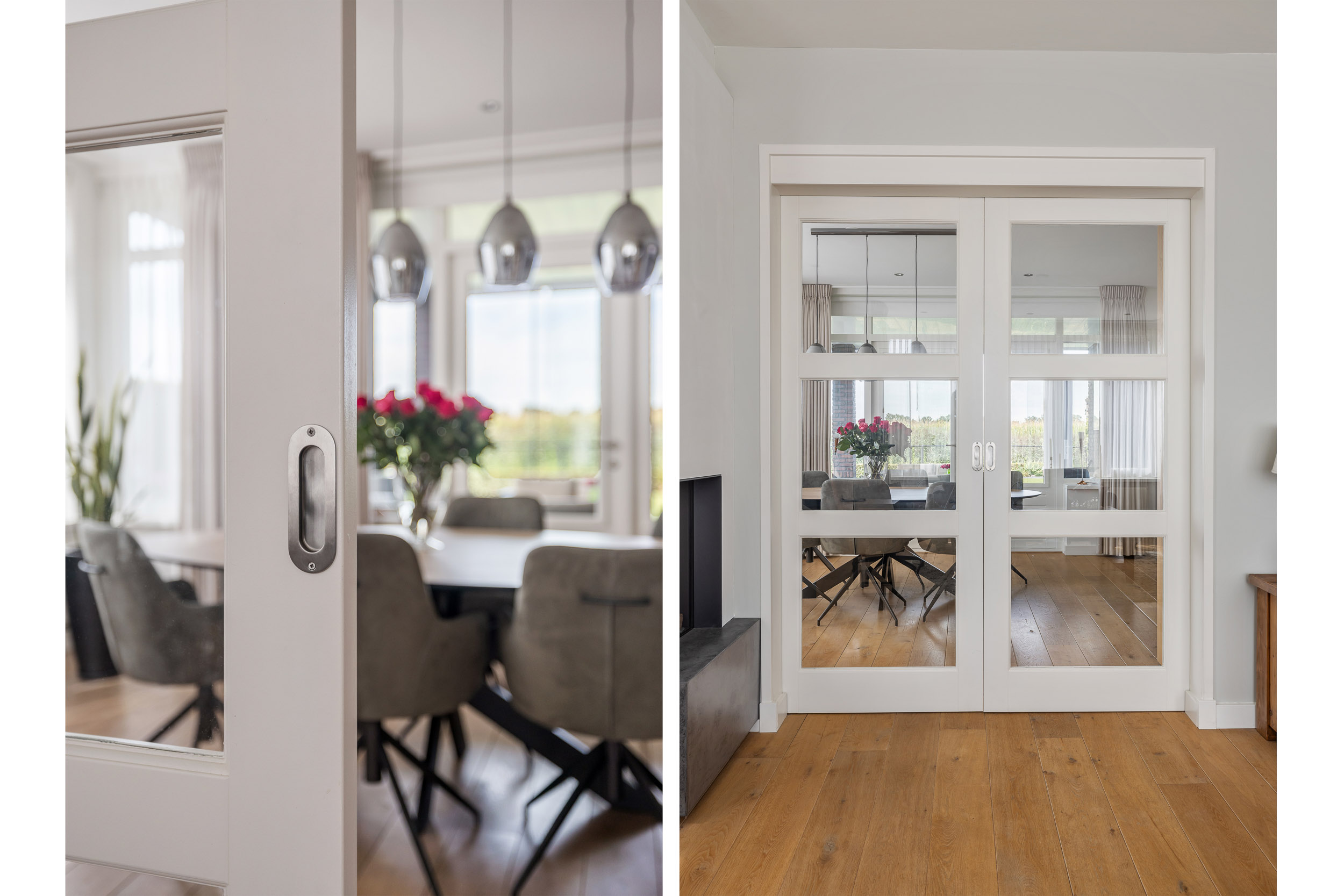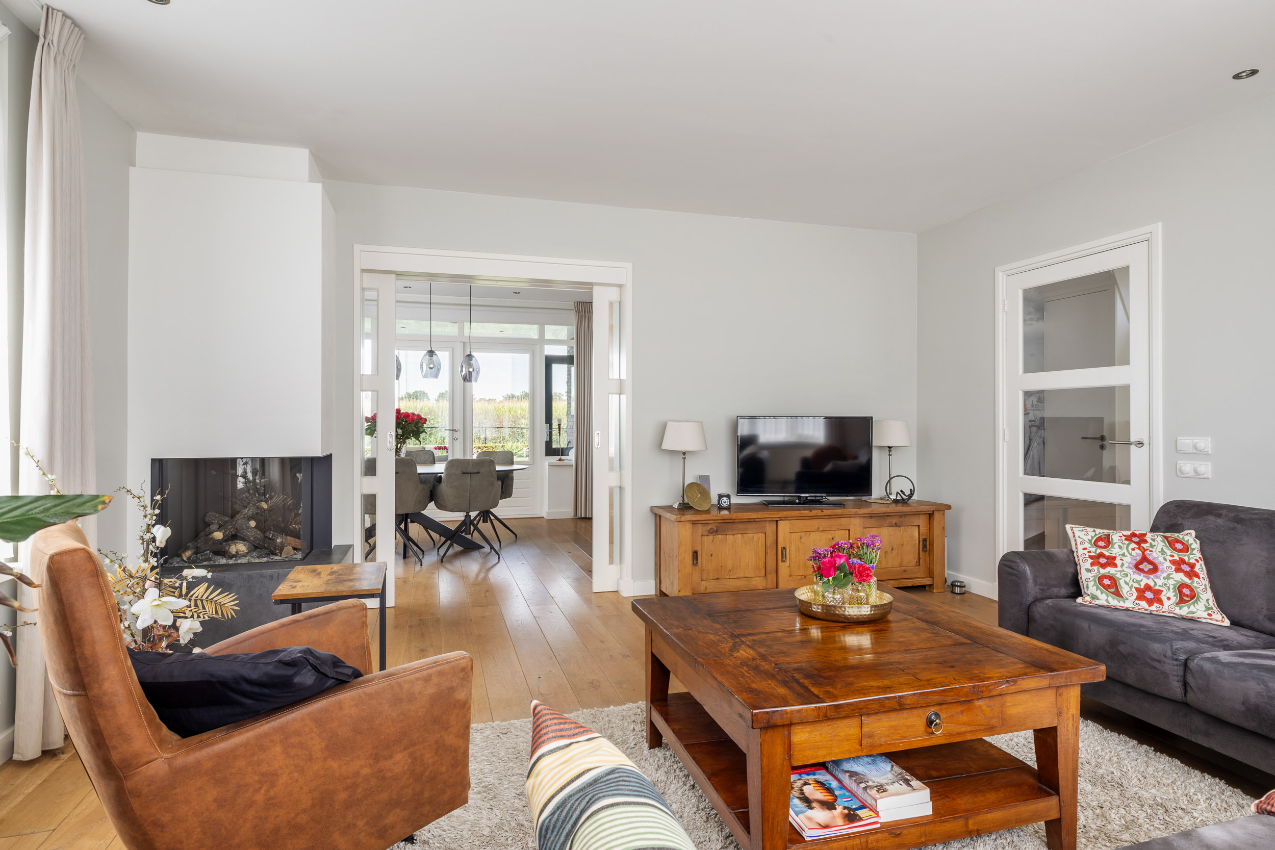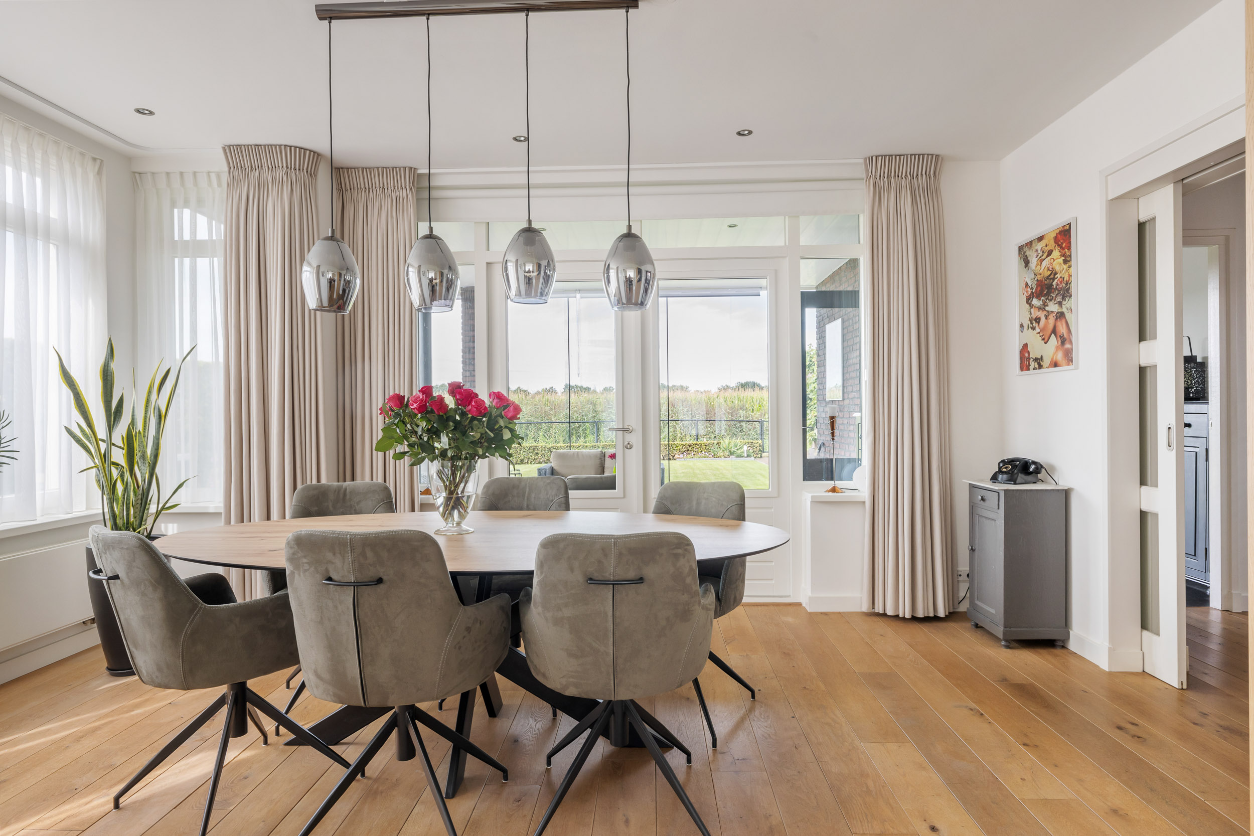 De lichte woonkamer is een heerlijke plek om te ontspannen. Dankzij de grote raampartijen in de zijgevel en de erker aan de voorzijde valt het daglicht royaal naar binnen. Een stijlvolle gashaard zorgt voor extra sfeer en warmte. Via de klassieke ensuite deuren bereik je de gezellige eetkamer, met uitzicht op de achtertuin en het uitgestrekte, landelijke landschap. De tweede erker versterkt opnieuw het licht en ruimtegevoel. Openslaande tuindeuren geven toegang tot de royale tuinkamer.