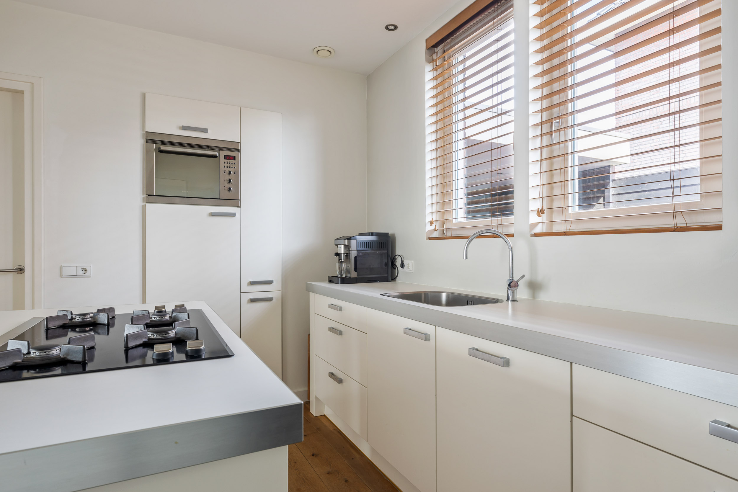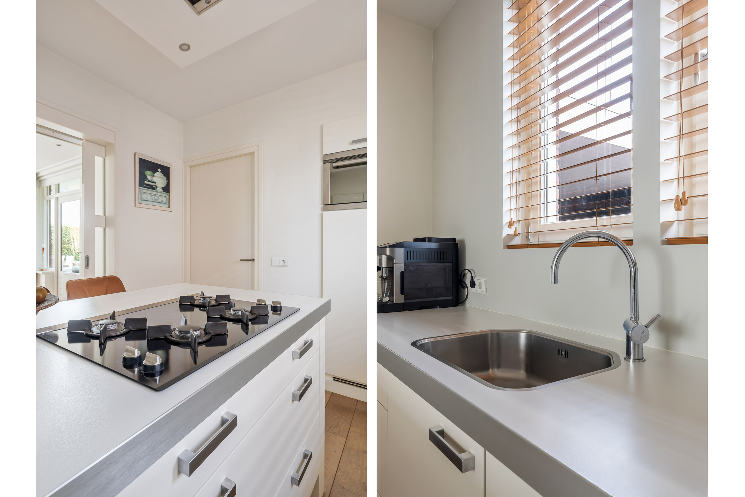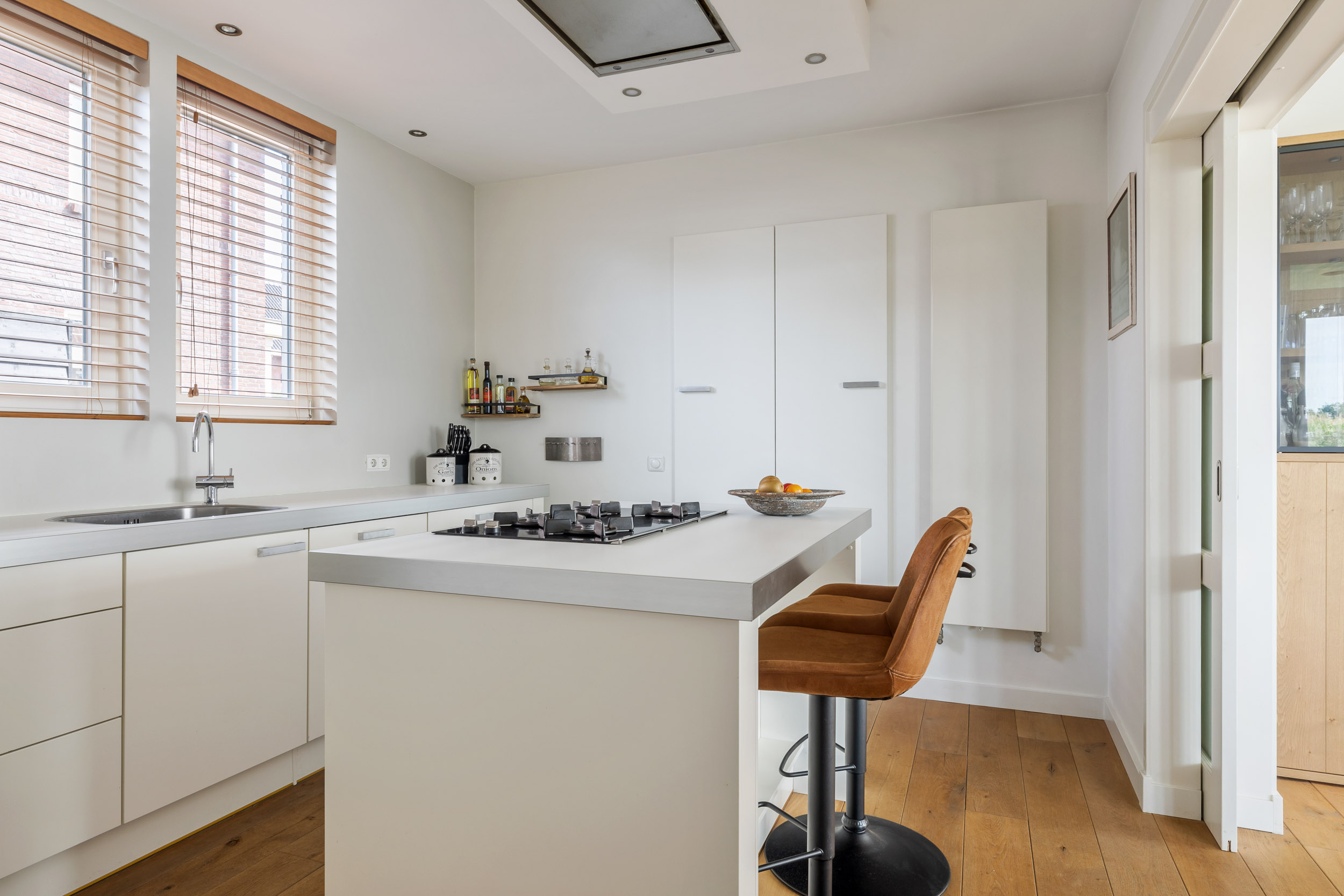 De keuken staat in directe verbinding met de eetkamer en is afsluitbaar via de ensuite deuren. Het gezellige kookeiland biedt plek voor twee barkrukken – perfect om aan te schuiven tijdens het koken. Er is volop bergruimte en de keuken is voorzien van diverse inbouwapparatuur: een groot gasfornuis met afzuigkap, combi-oven, koelkast en een vaatwasser.