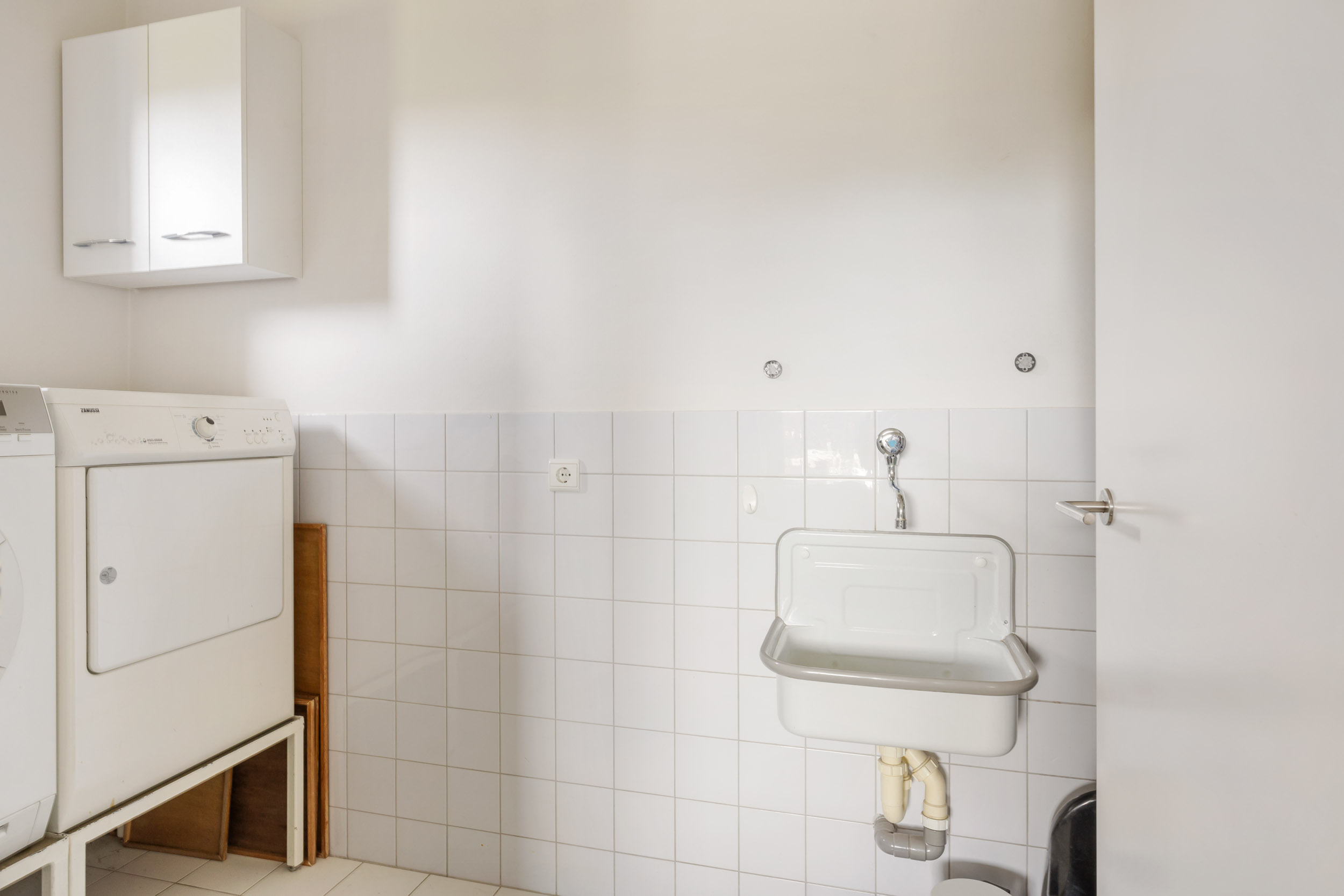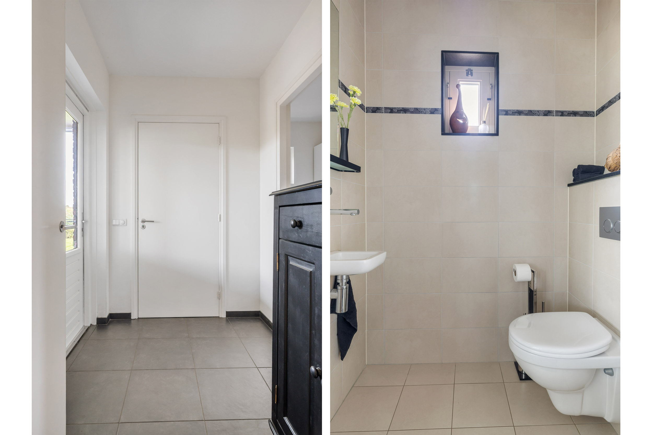 Achter de keuken bevindt zich het achterportaal, dat via de achterom bereikbaar is. Hier vind je de toiletruimte en toegang tot de praktische wasruimte met aansluiting voor wasmachine en droger, een uitstortgootsteen en extra bergruimte.