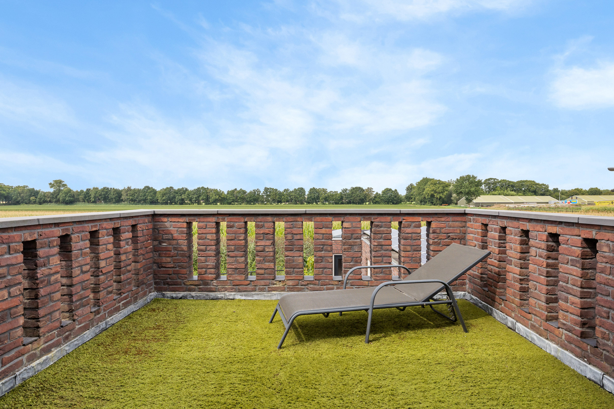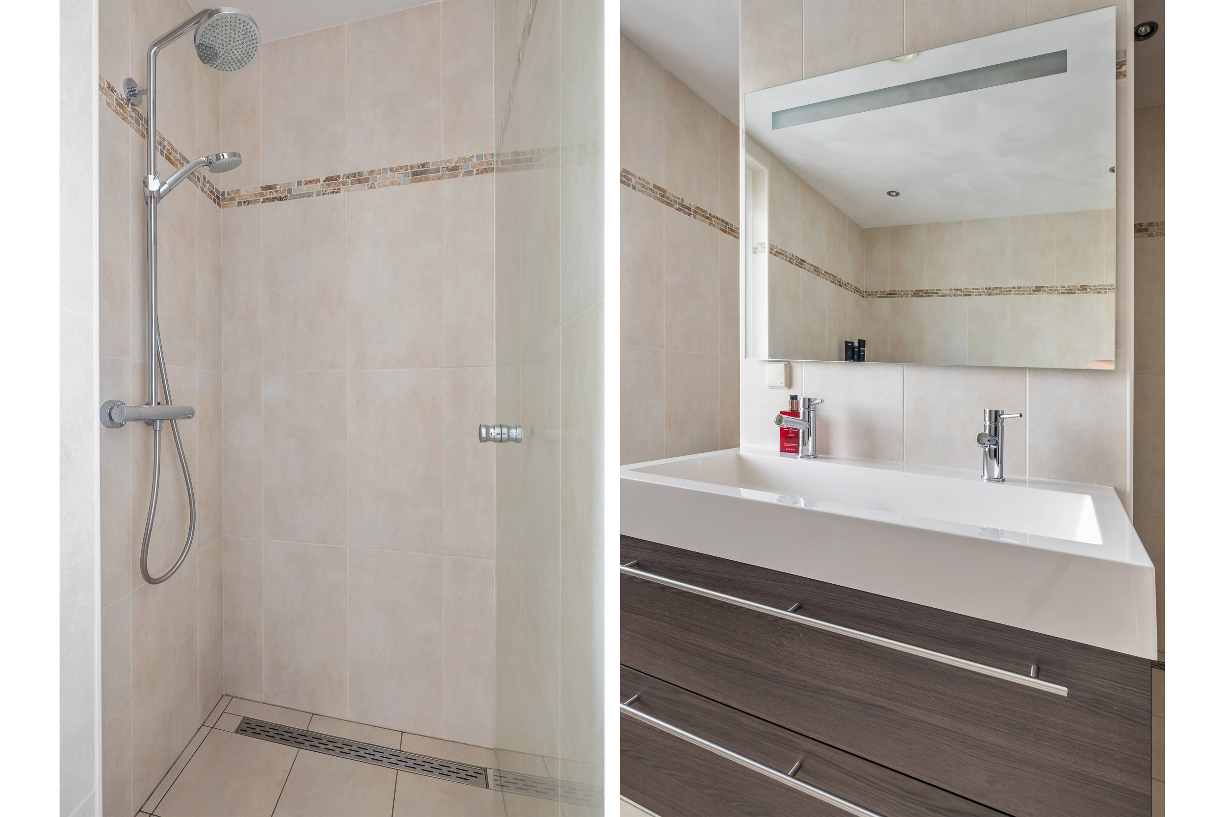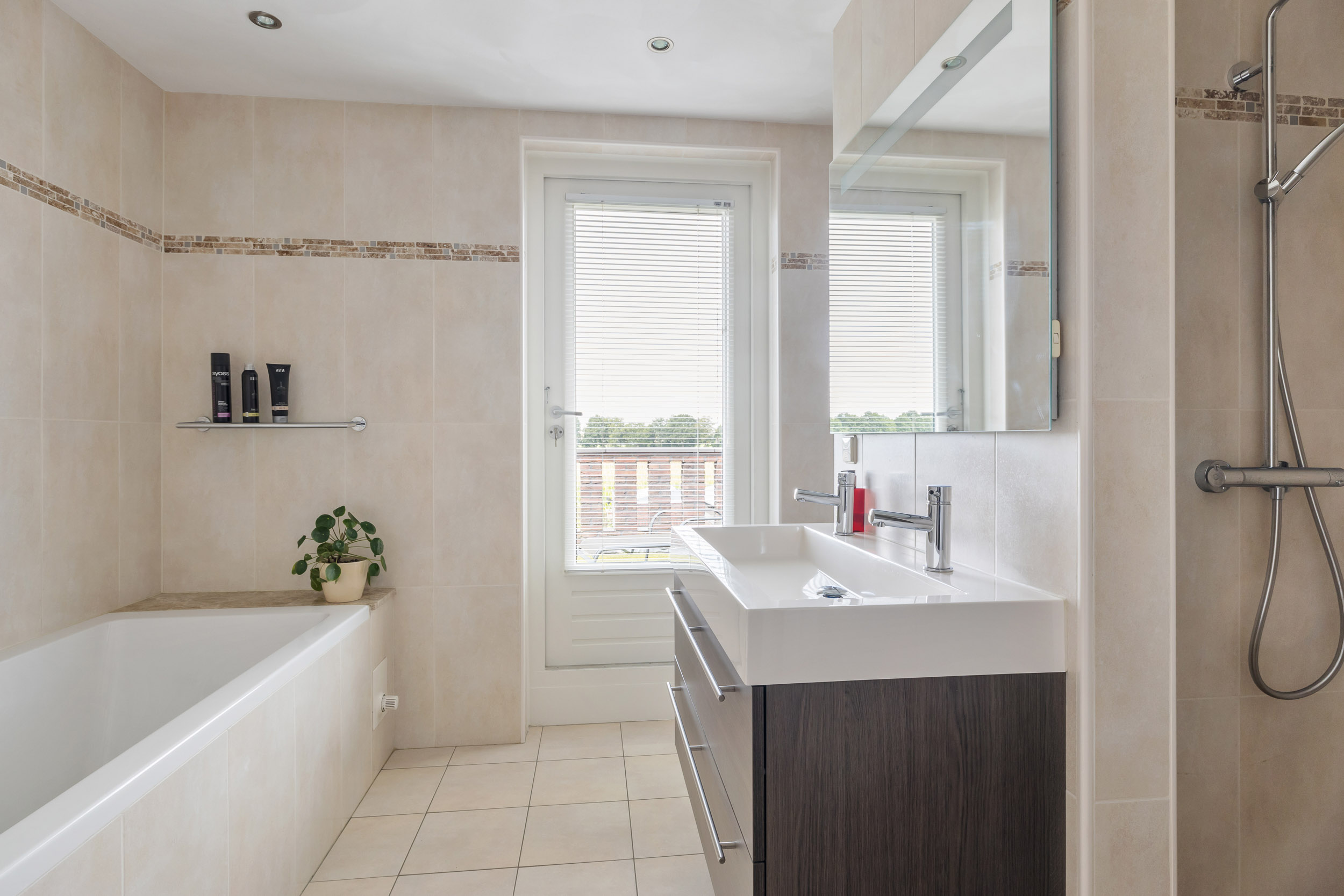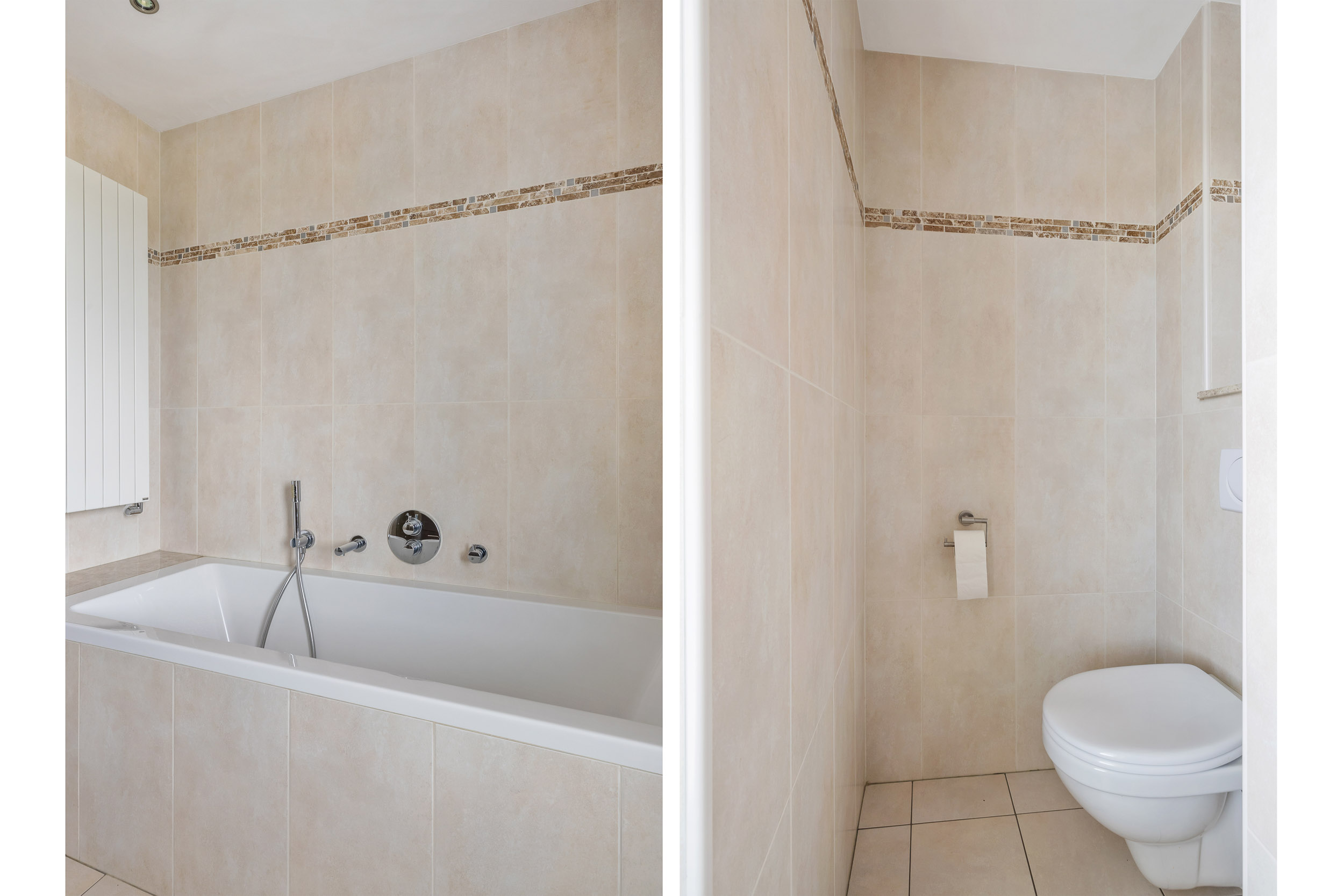 De ruime badkamer is compleet uitgerust met een ligbad, dubbele wastafel, inloopdouche en toilet. Vanuit de badkamer stap je zo het balkon/dakterras op, waar je kunt genieten van een fantastisch vrij uitzicht.