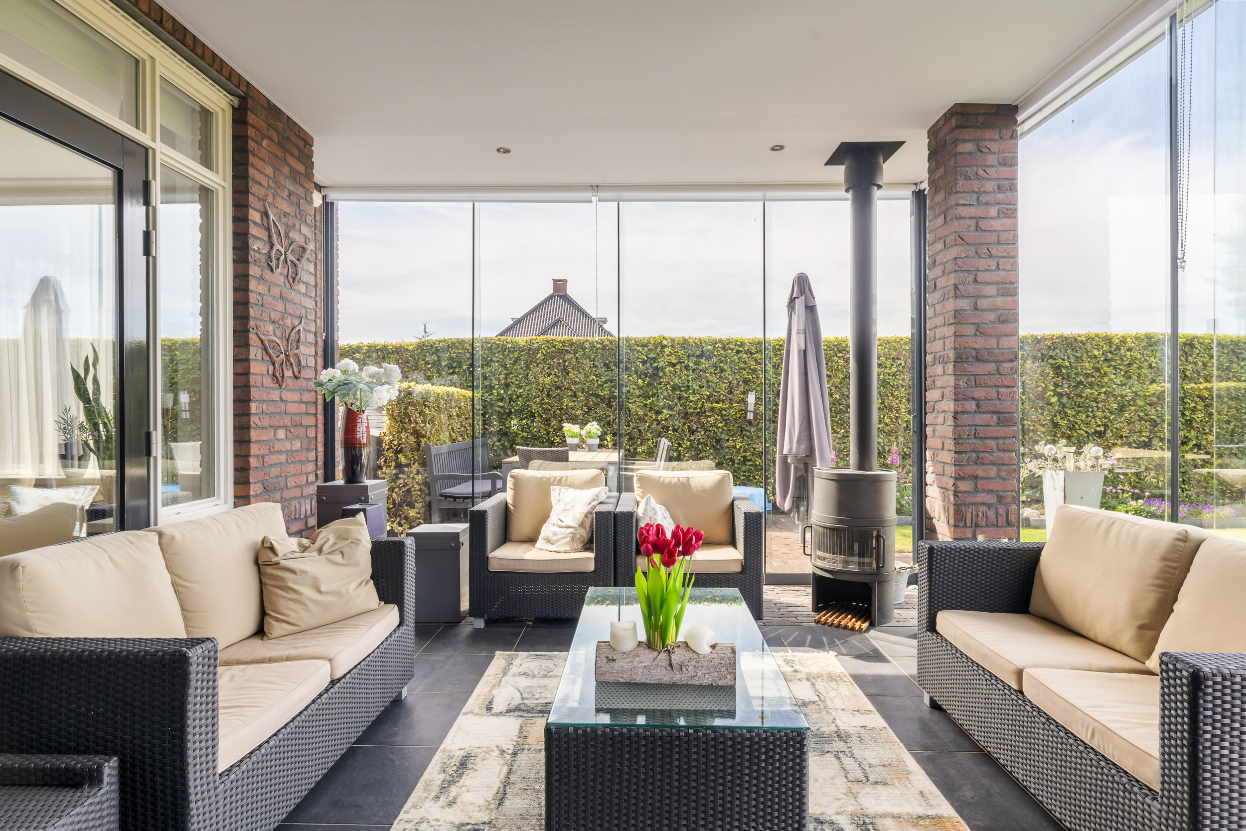 Via de achterdeur bereik je de in 2023 geplaatste, volledig gefundeerde tuinkamer. De geïsoleerde vloer zorgt voor comfort, en dankzij de schuifwanden kun je deze ruimte volledig openen op warme dagen of juist afsluiten tijdens koelere avonden. Een gezellige houtkachel maakt het plaatje compleet.
