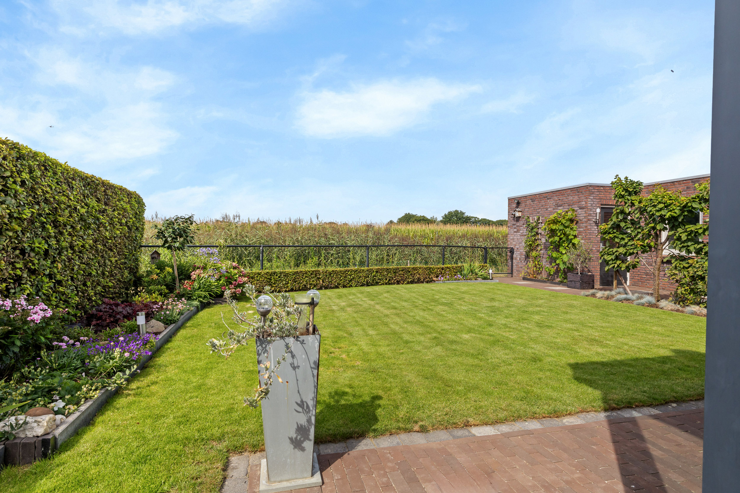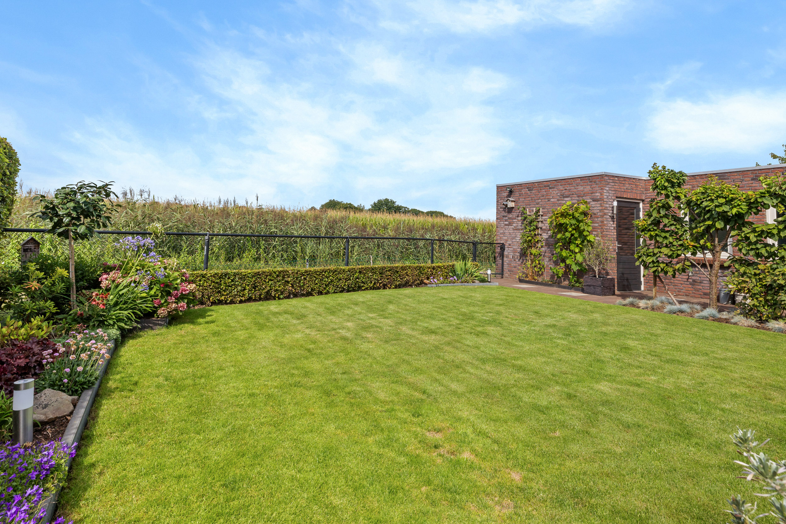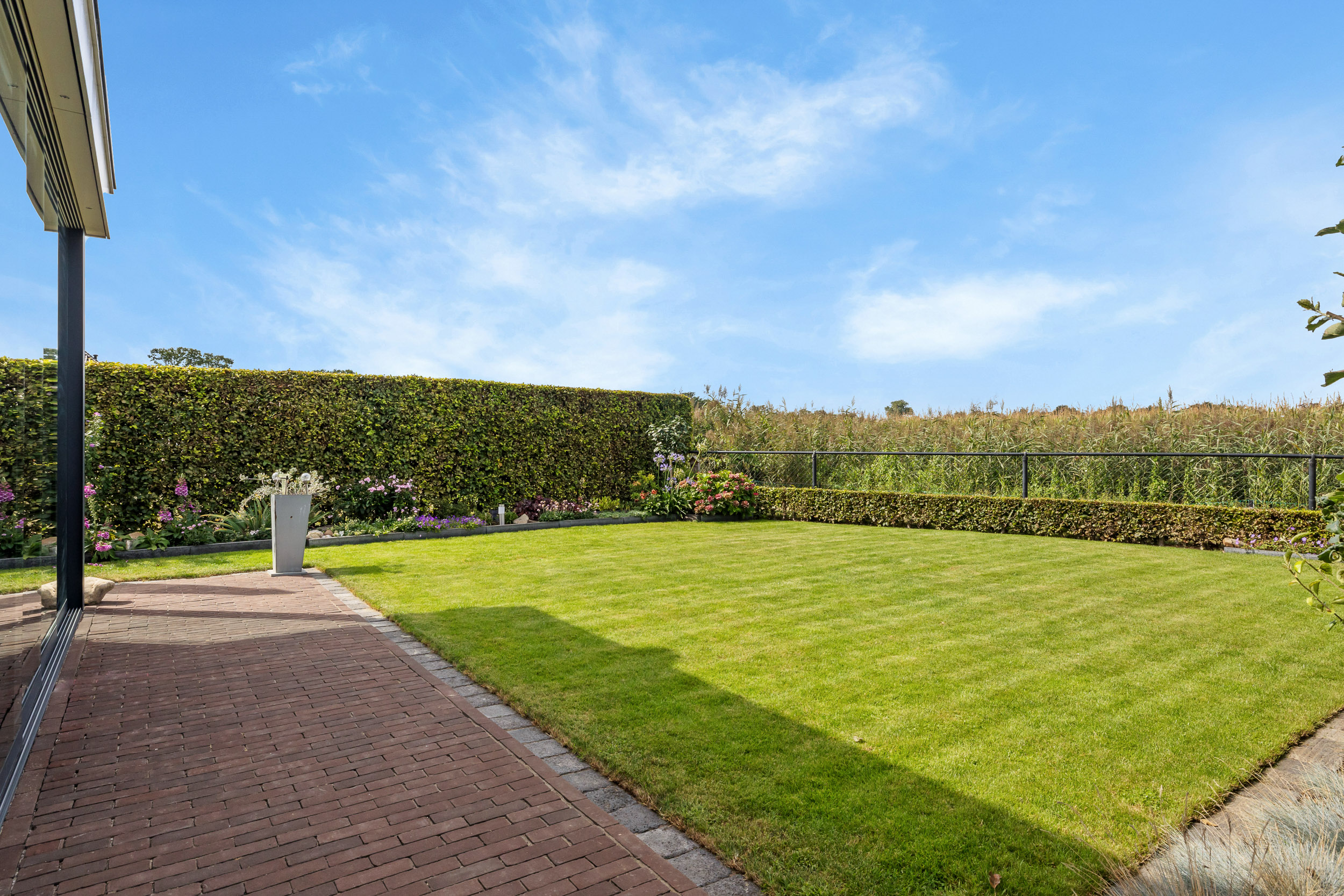 De prachtig aangelegde tuin ligt op het westen en biedt een uniek vrij uitzicht over het omliggende landelijke gebied. Er zijn diverse borders, een ruim gazon en een extra terras aan de zijkant van de woning. De tuin is aan beide zijden achterom bereikbaar via poorten.