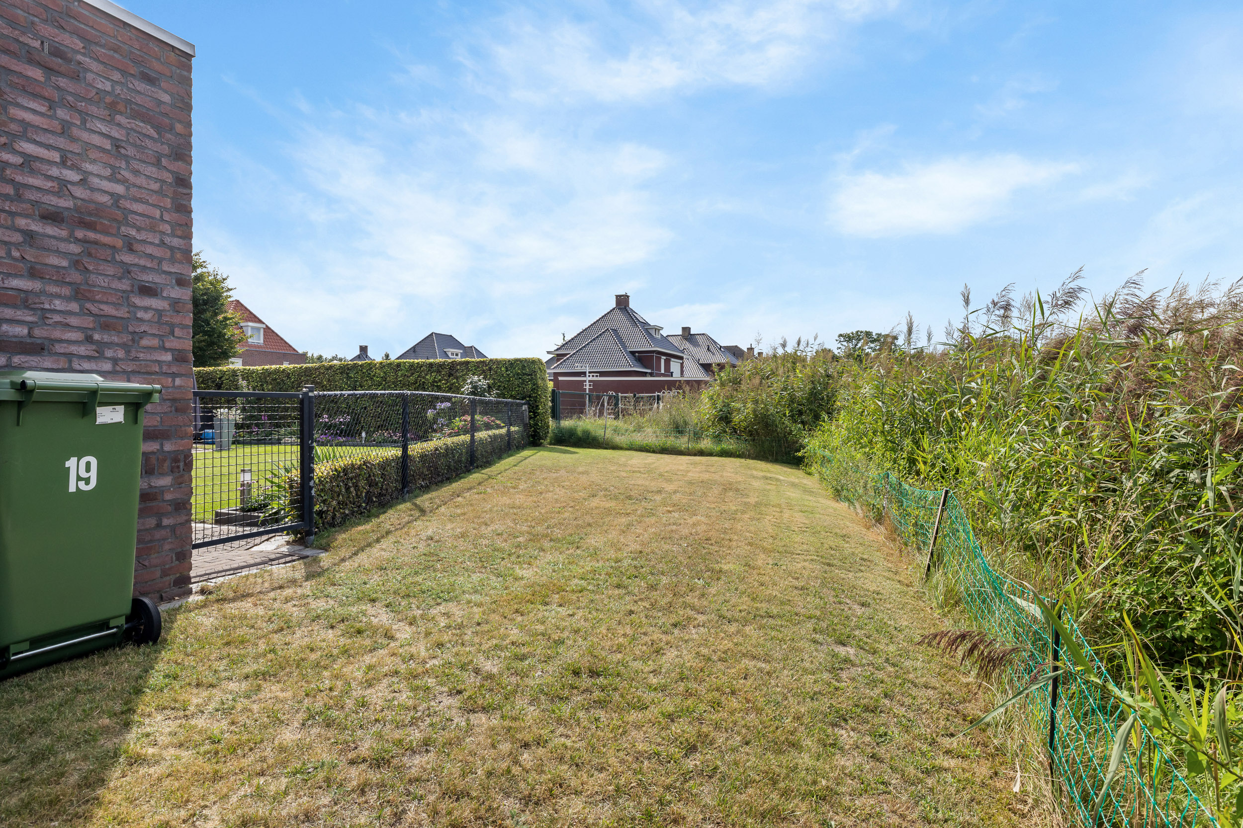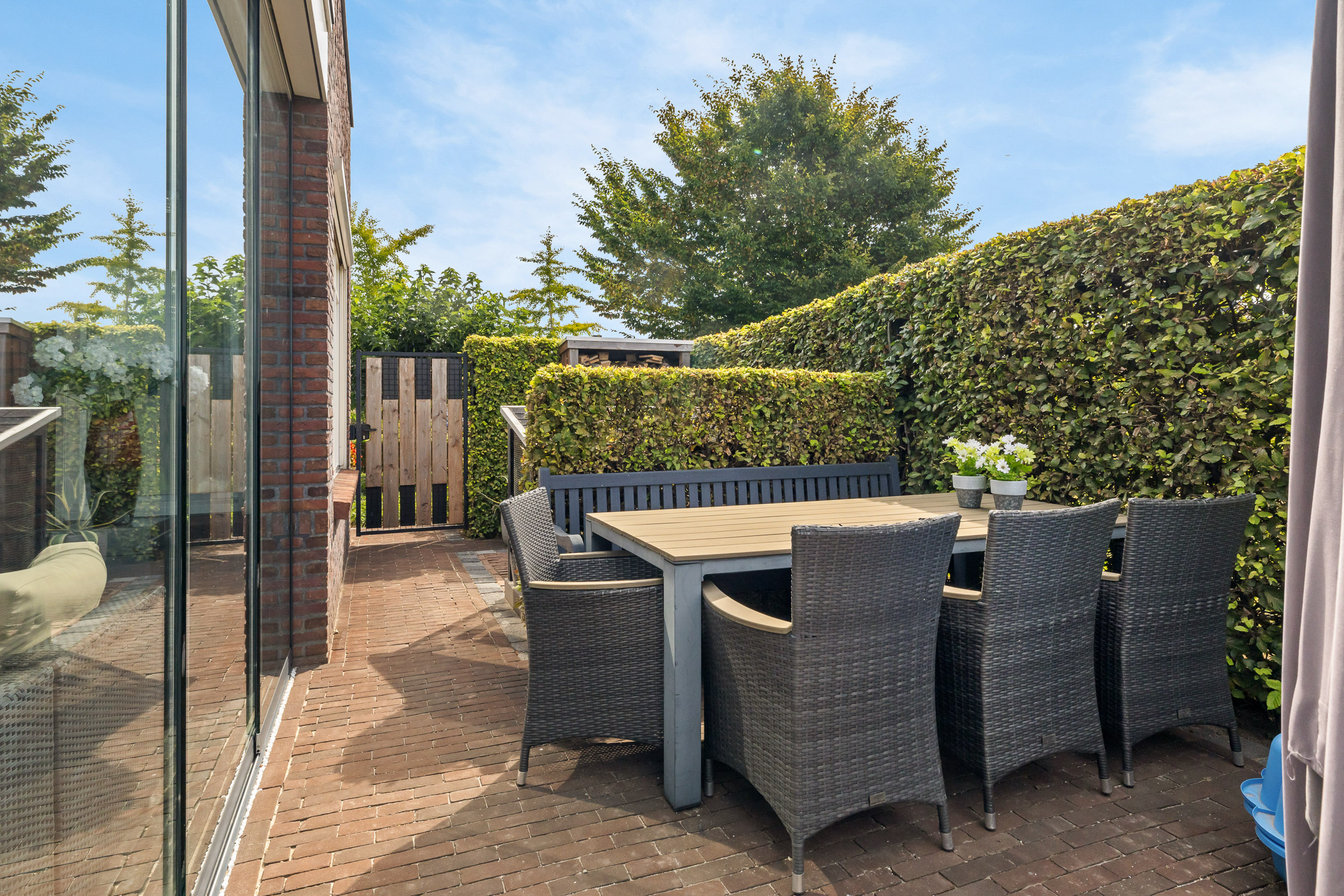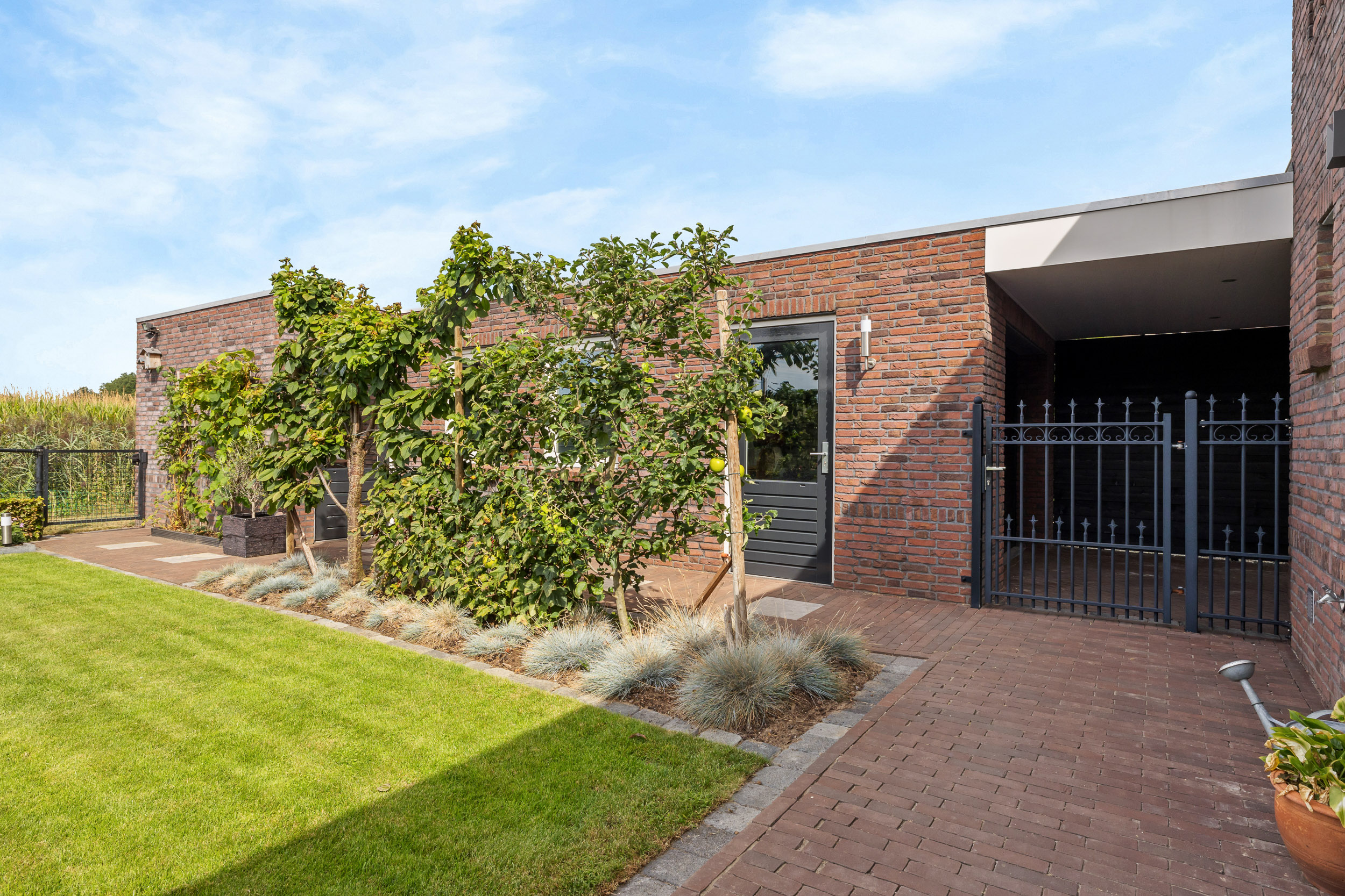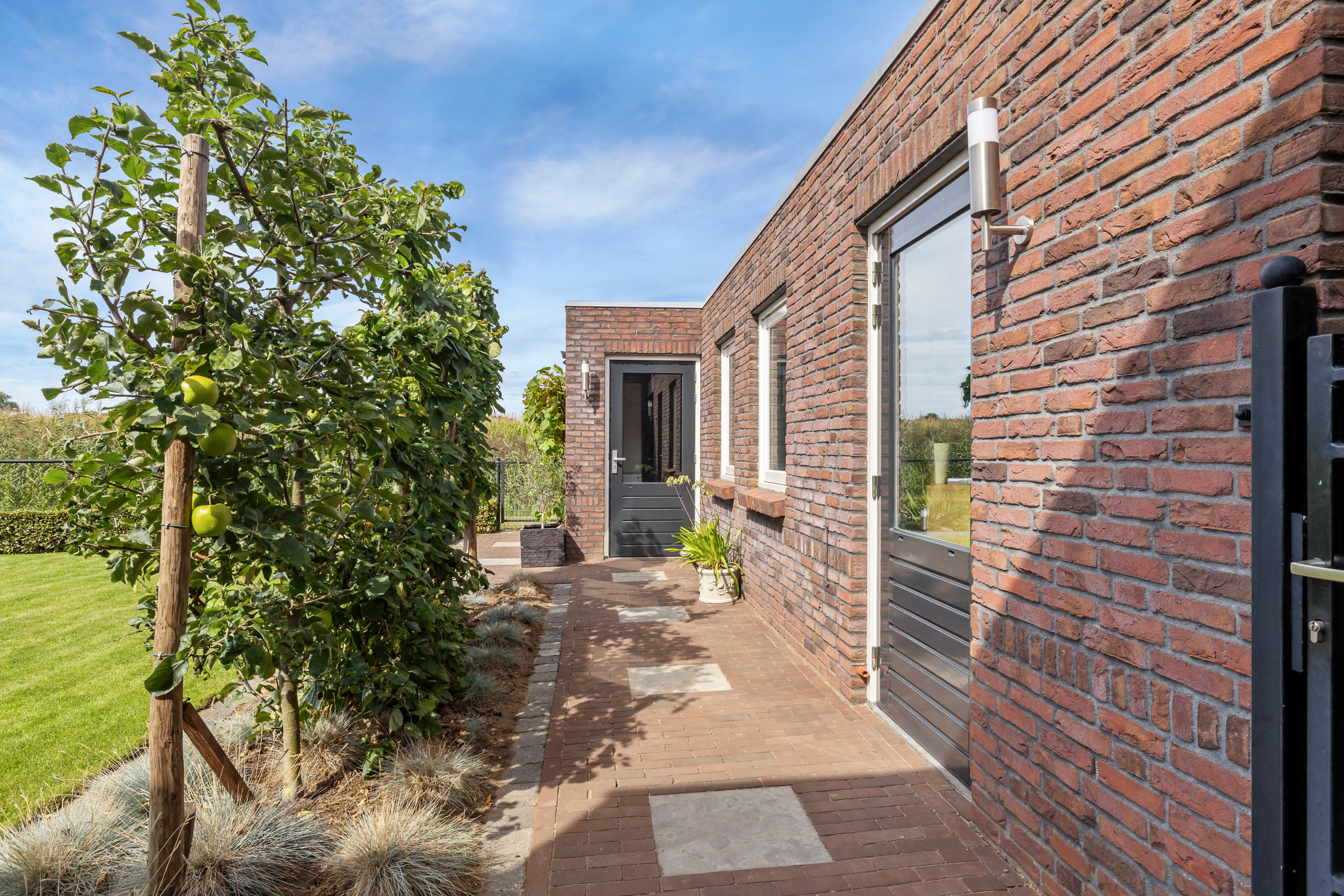 De prachtig aangelegde tuin ligt op het westen en biedt een uniek vrij uitzicht over het omliggende landelijke gebied. Er zijn diverse borders, een ruim gazon en een extra terras aan de zijkant van de woning. De tuin is aan beide zijden achterom bereikbaar via poorten.
