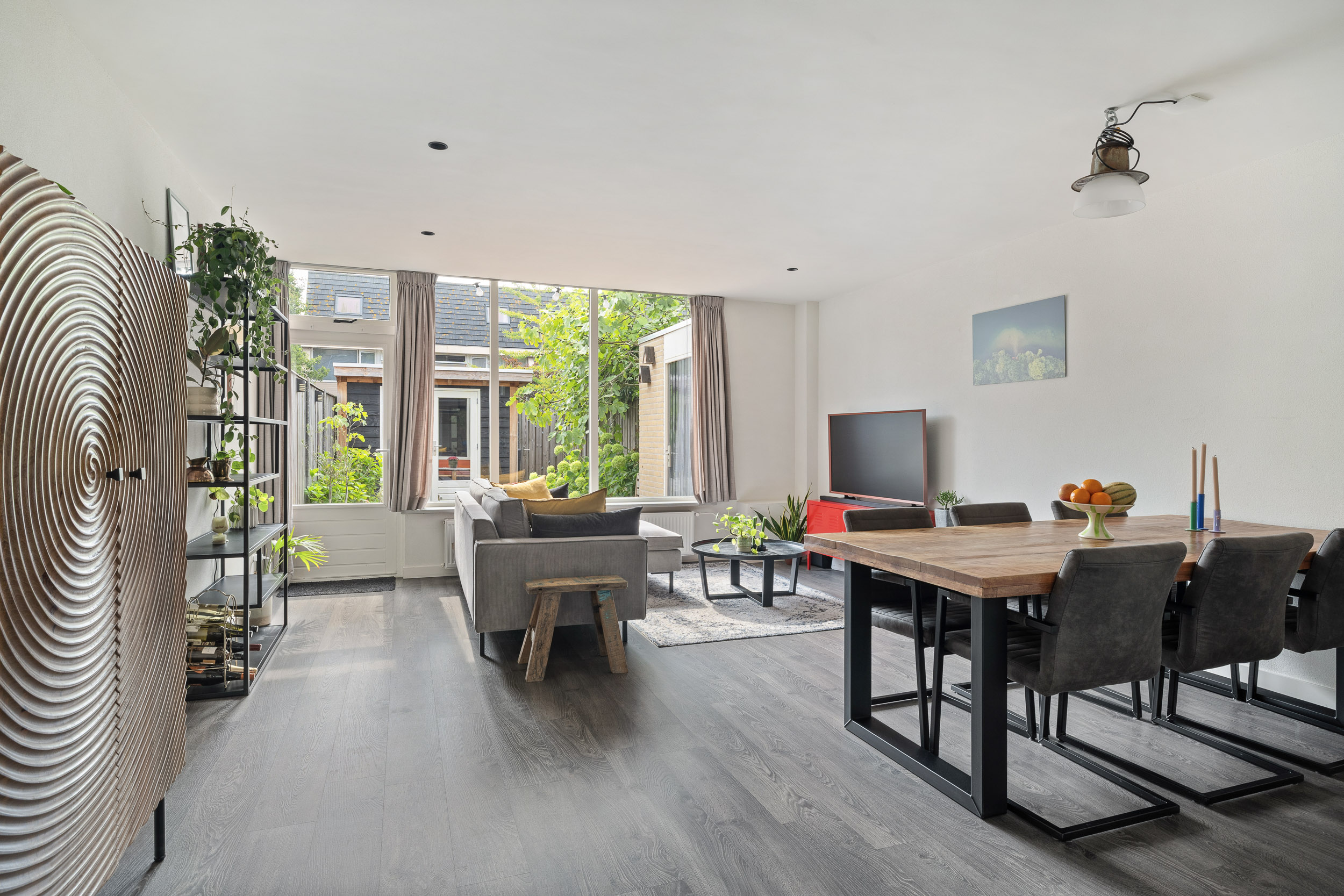 Via een moderne zwarte tussendeur in staallook bereik je de woonkamer, waar de laminaatvloer keurig is doorgelegd. De grote raampartijen en de loopdeur aan de achterzijde zorgen voor veel natuurlijk licht en geven uitzicht op de fraai aangelegde achtertuin. Inbouwspots zijn netjes in het plafond verwerkt, wat de woonkamer een moderne uitstraling geeft.