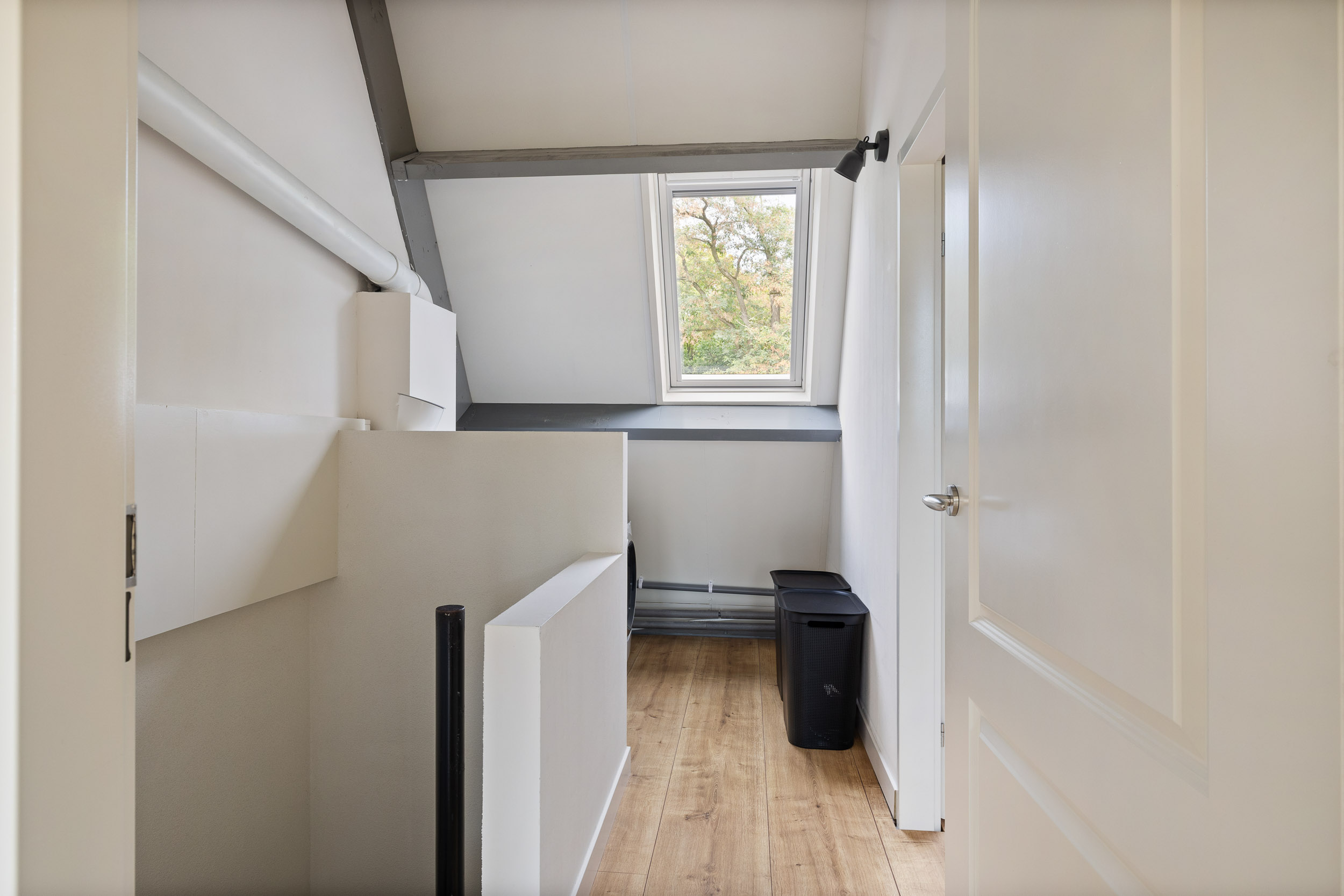 De zolderverdieping is verrassend ruim. Hier bevindt zich de ouderslaapkamer van ca. 23 m² en een kleinere slaapkamer van ca. 9 m², die momenteel in gebruik is als inloopkast. Op de voorzolder is plaats voor de wasmachine en droger, en onder de schuine kap bevindt zich extra kastruimte. De gehele verdieping is afgewerkt met een nette laminaatvloer en gestucte wanden.