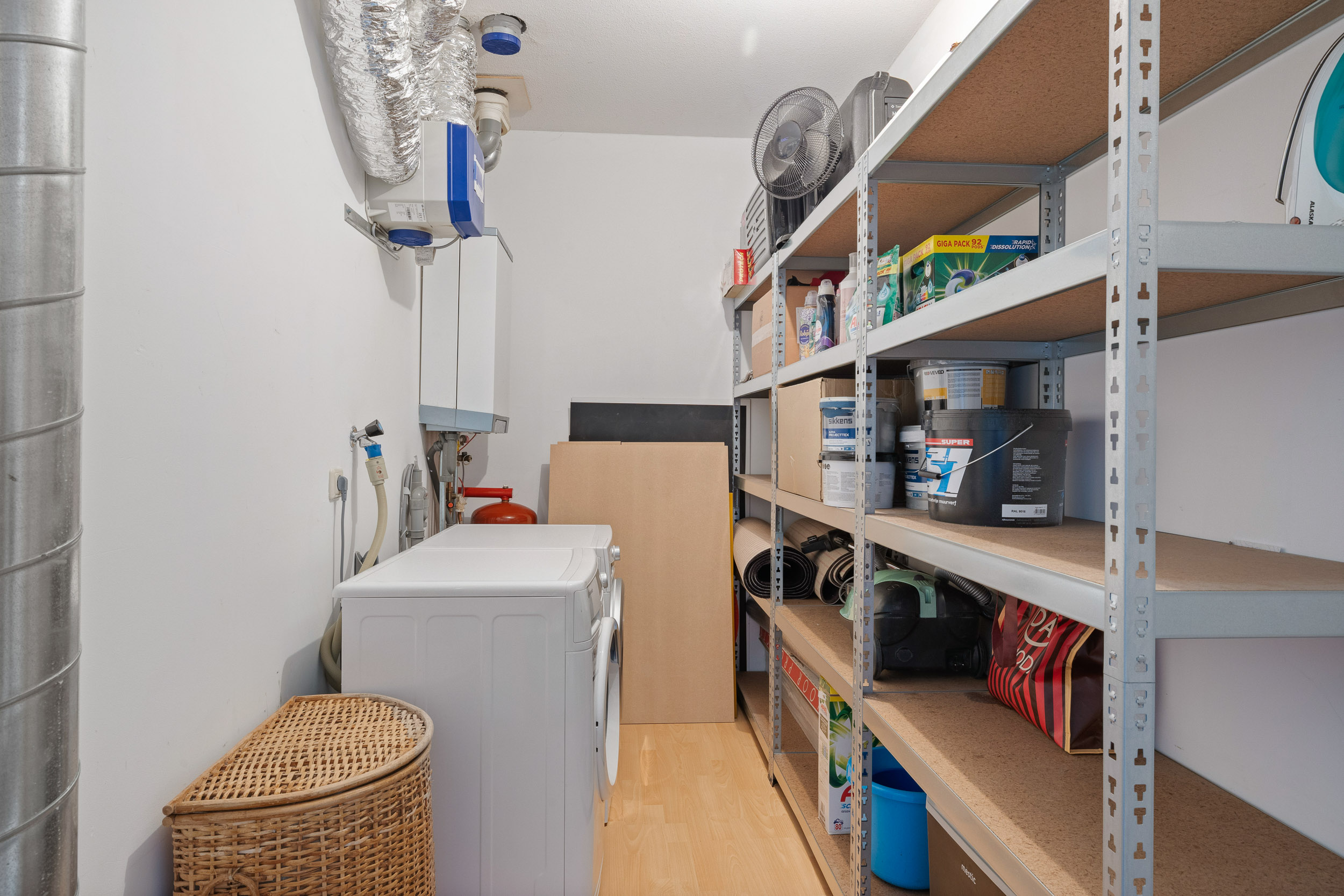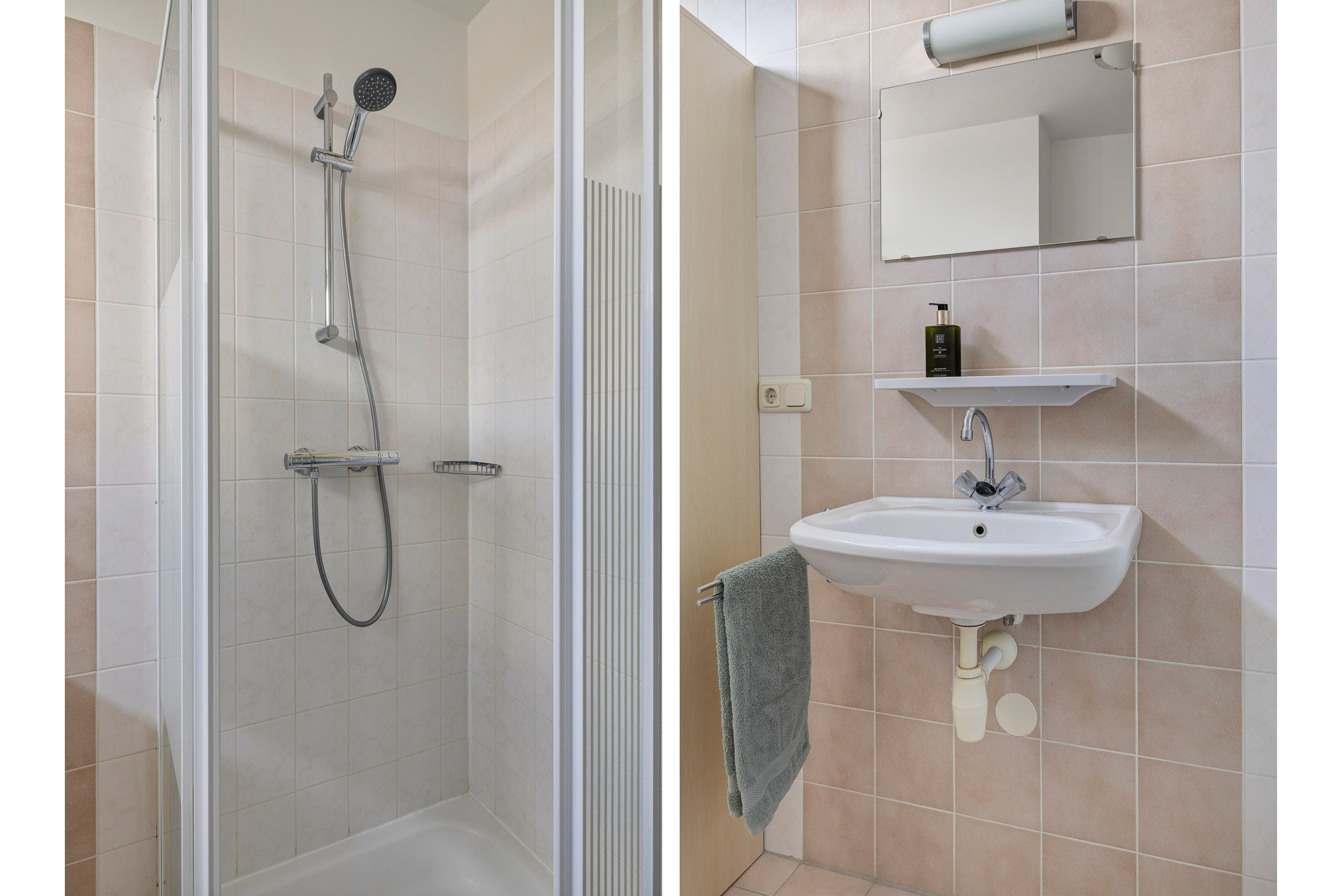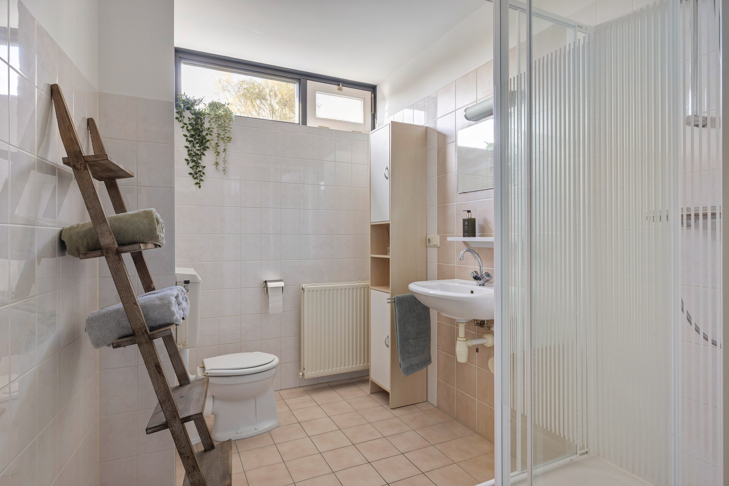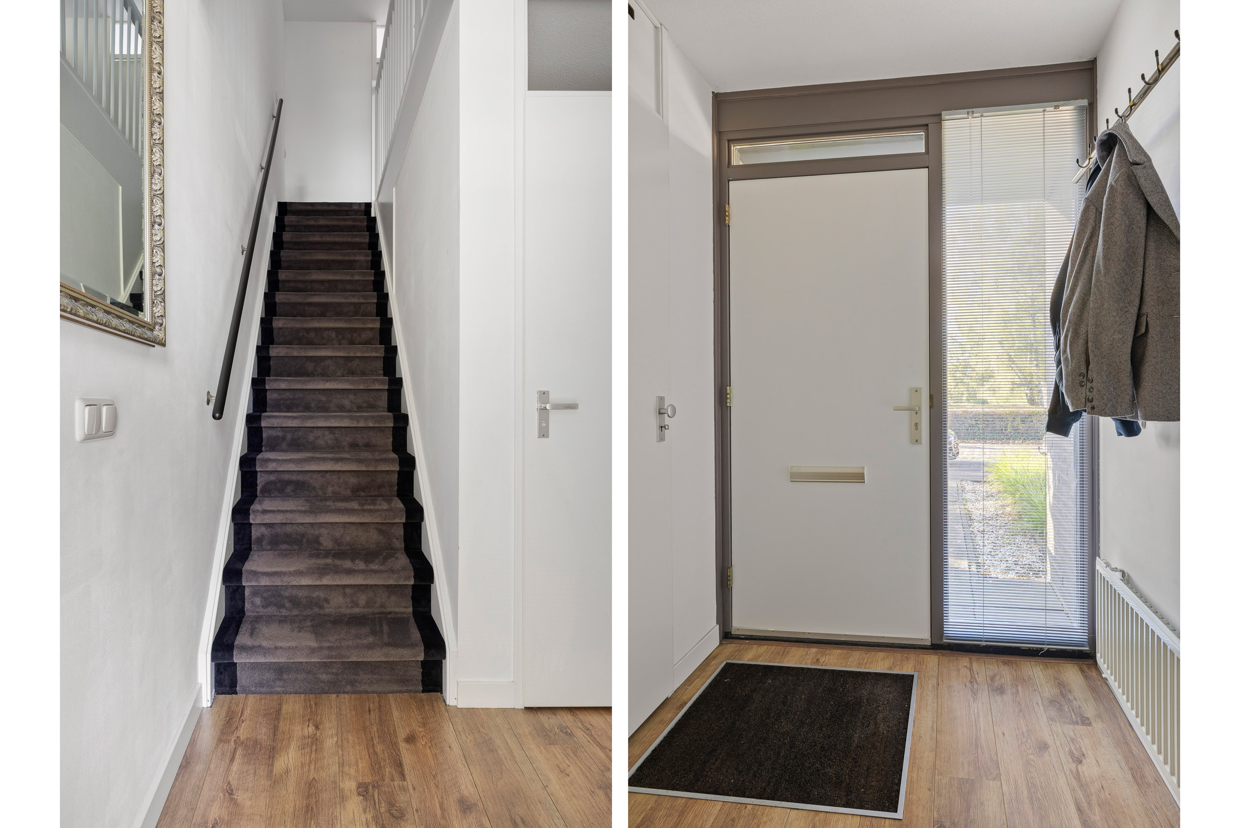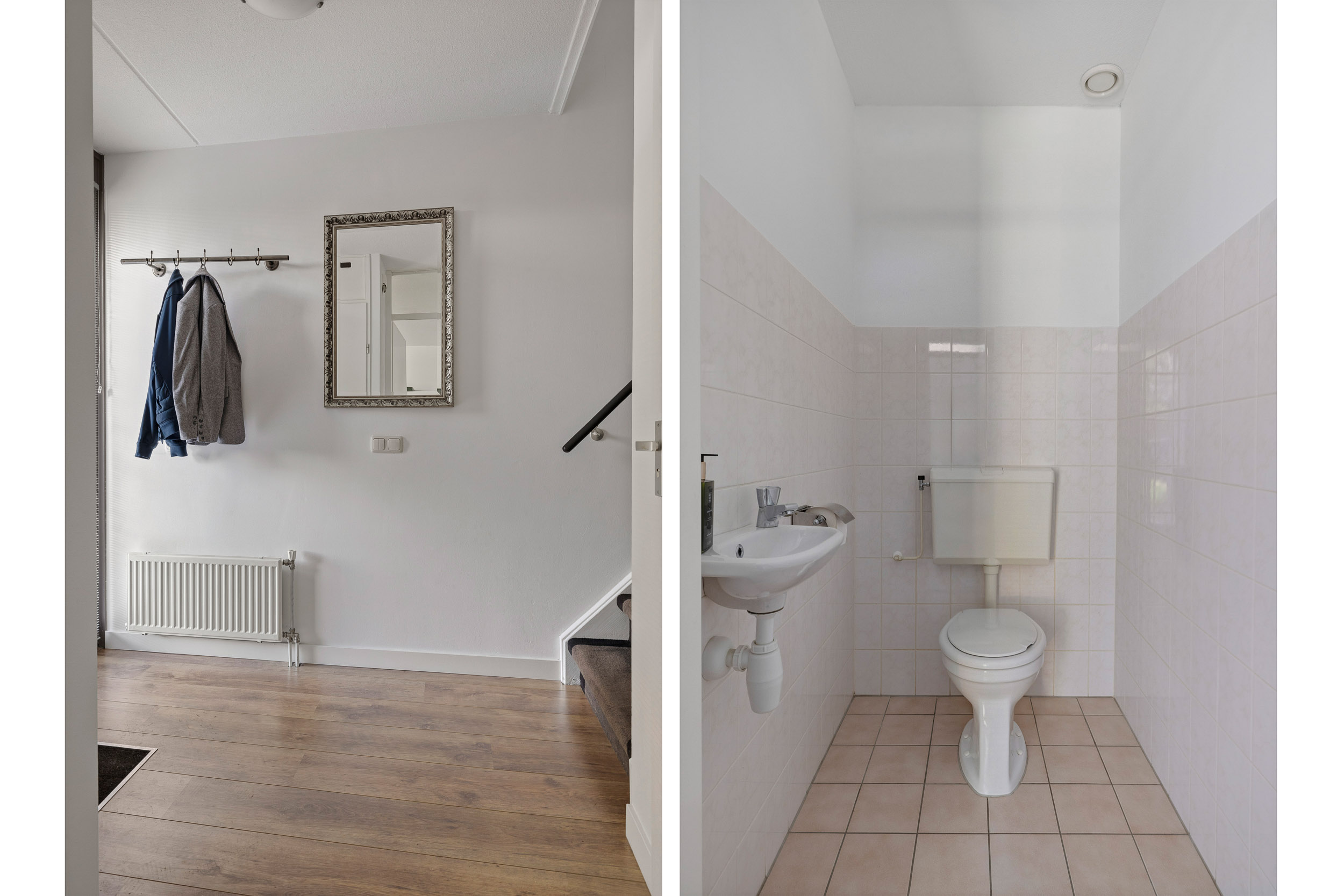 Bij binnenkomst in de hal bevinden zich de meterkast, de trapopgang naar de eerste verdieping en de ruime, volledig betegelde toiletruimte met toilet en fonteintje. De vloer op de begane grond is afgewerkt met hoogwaardig laminaat, dat naadloos doorloopt.