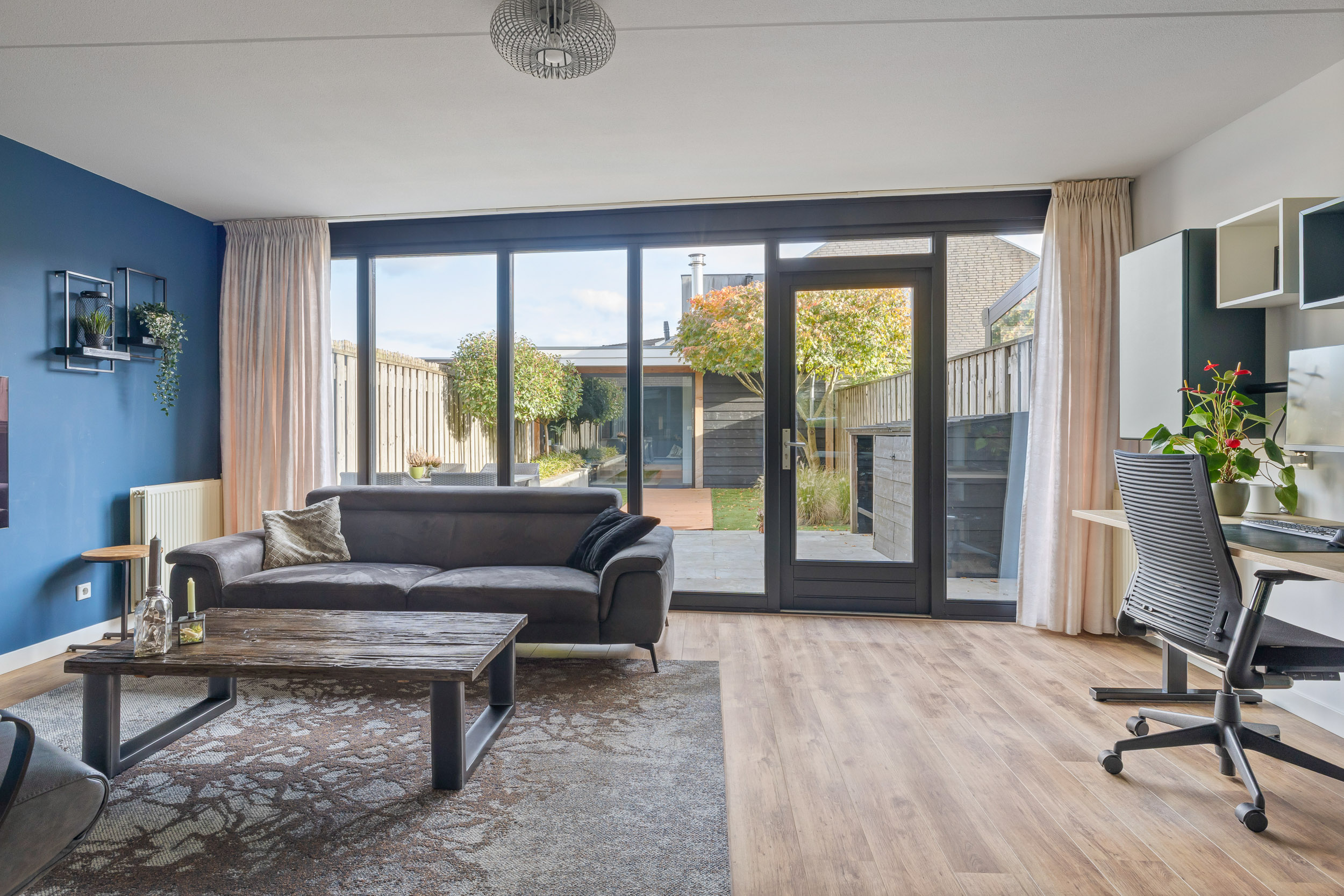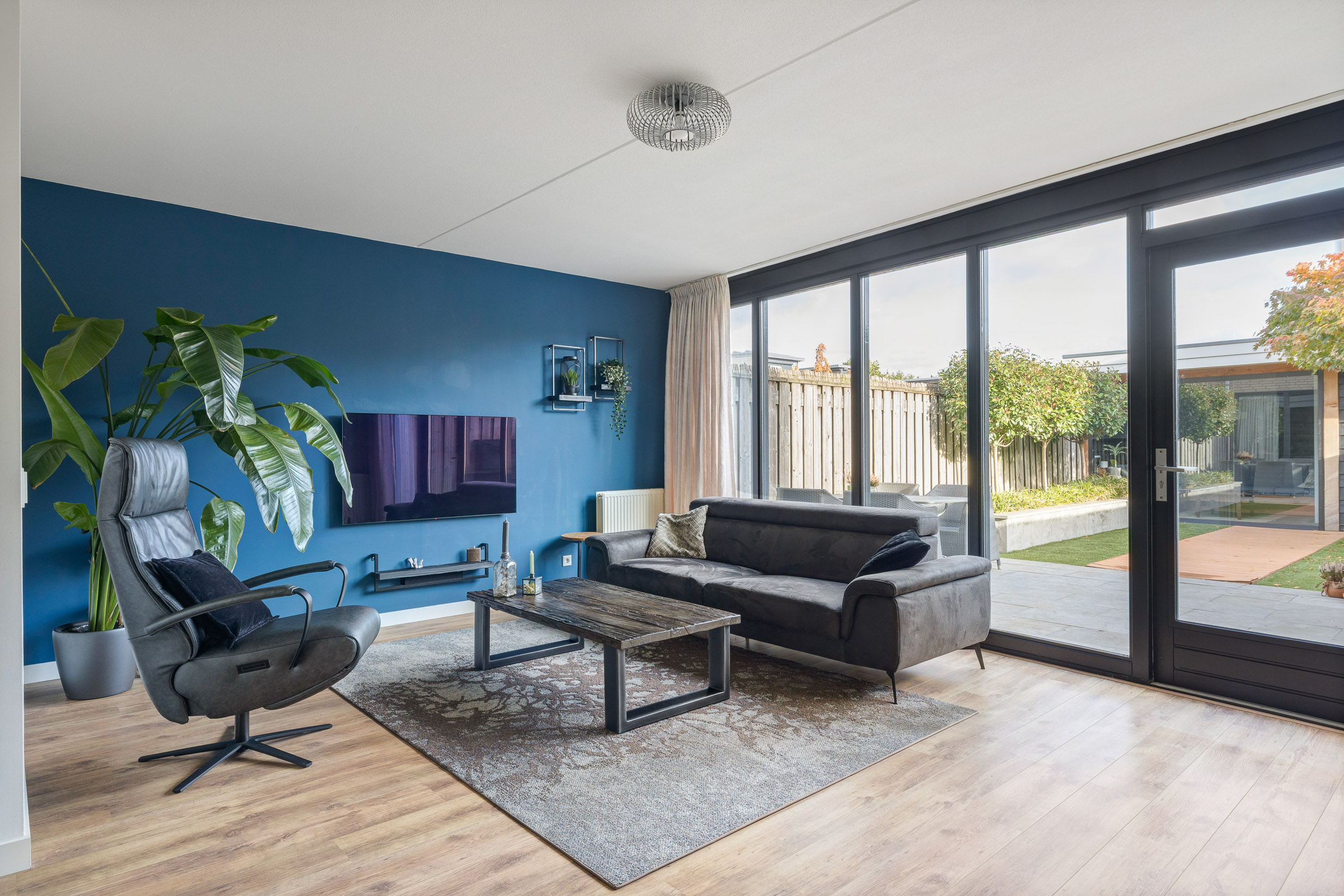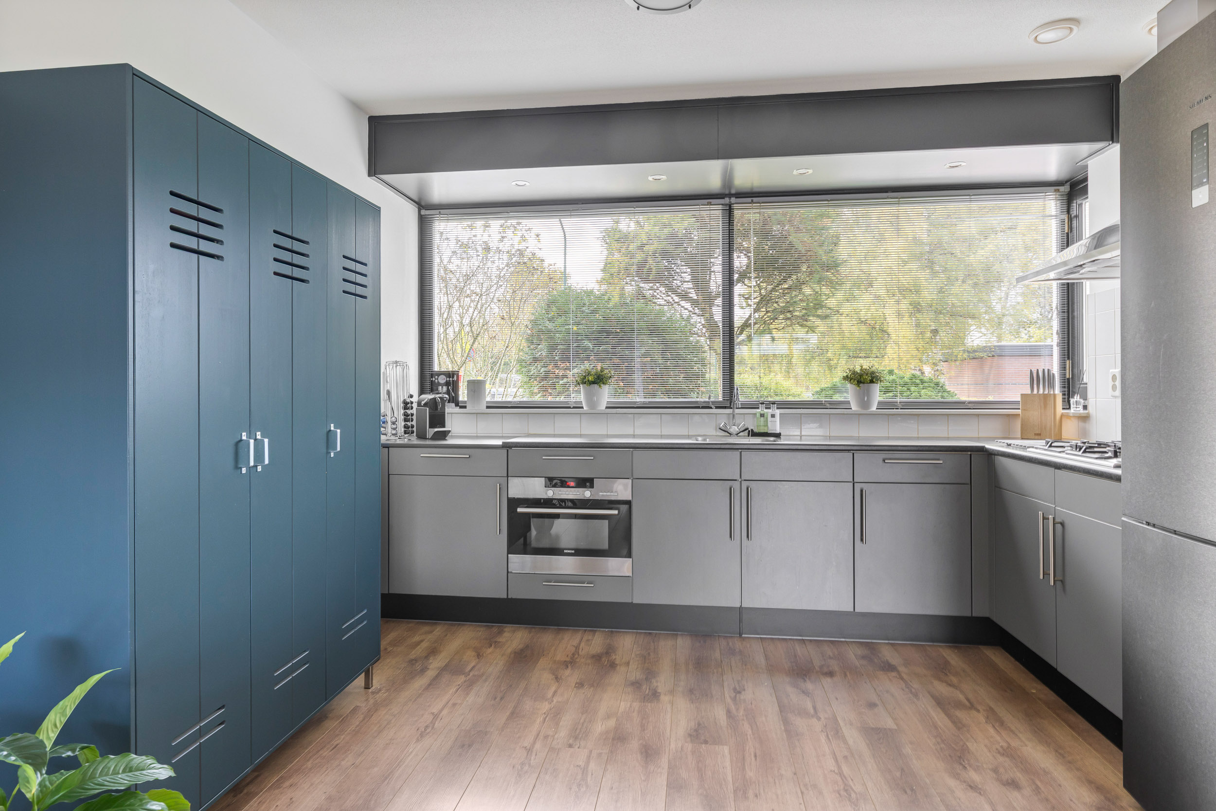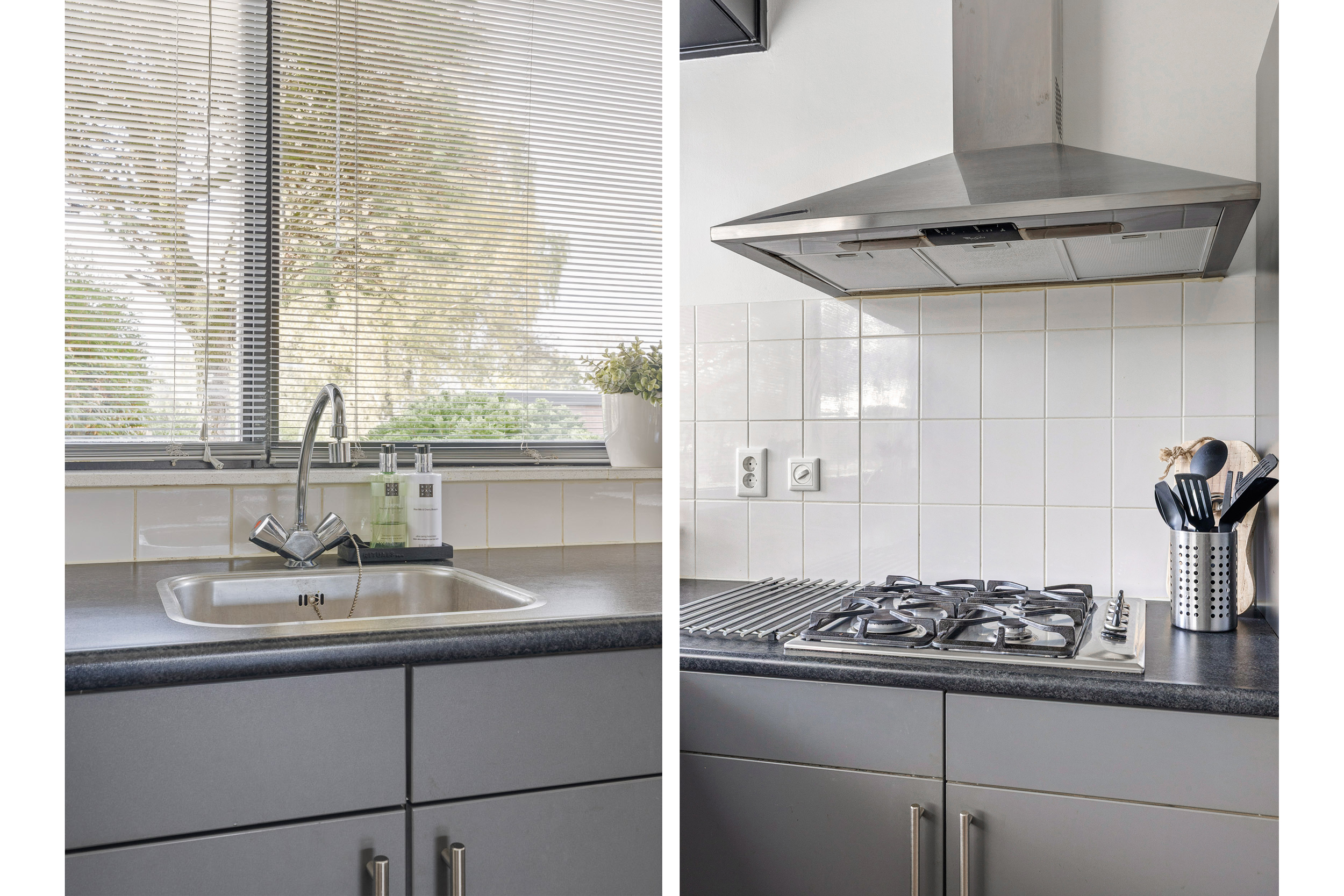 De woonkamer is opvallend licht en ruim, met de open keuken aan de voorzijde en de zithoek aan de achterzijde. De keuken is uitgevoerd in een moderne kleurstelling met grijze kastfronten en een antraciet werkblad. Voorzieningen zijn o.a. een inbouwoven, vaatwasser, 4-pits gasfornuis en afzuigkap. Dankzij de grote raampartijen aan zowel de voor- als achterzijde valt er veel daglicht binnen. Daarnaast ervaar je volop privacy door de geringe inkijk.