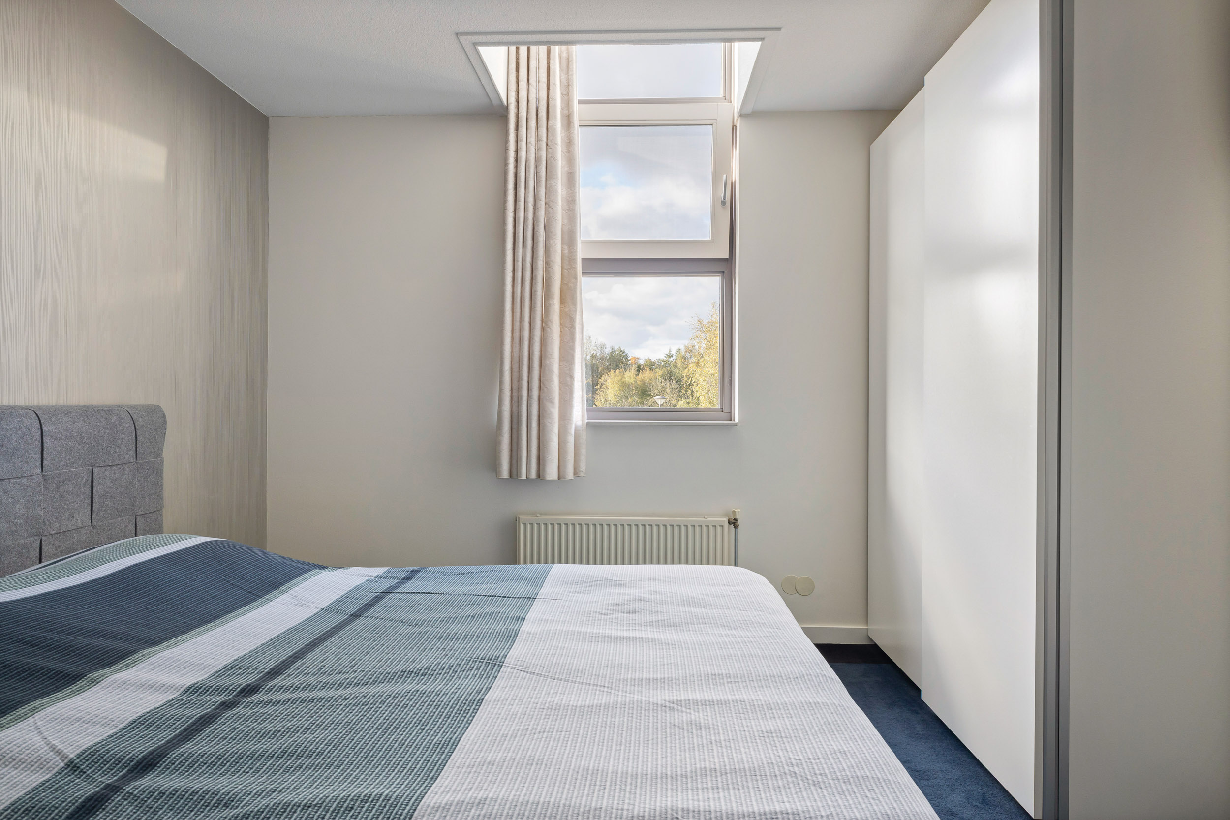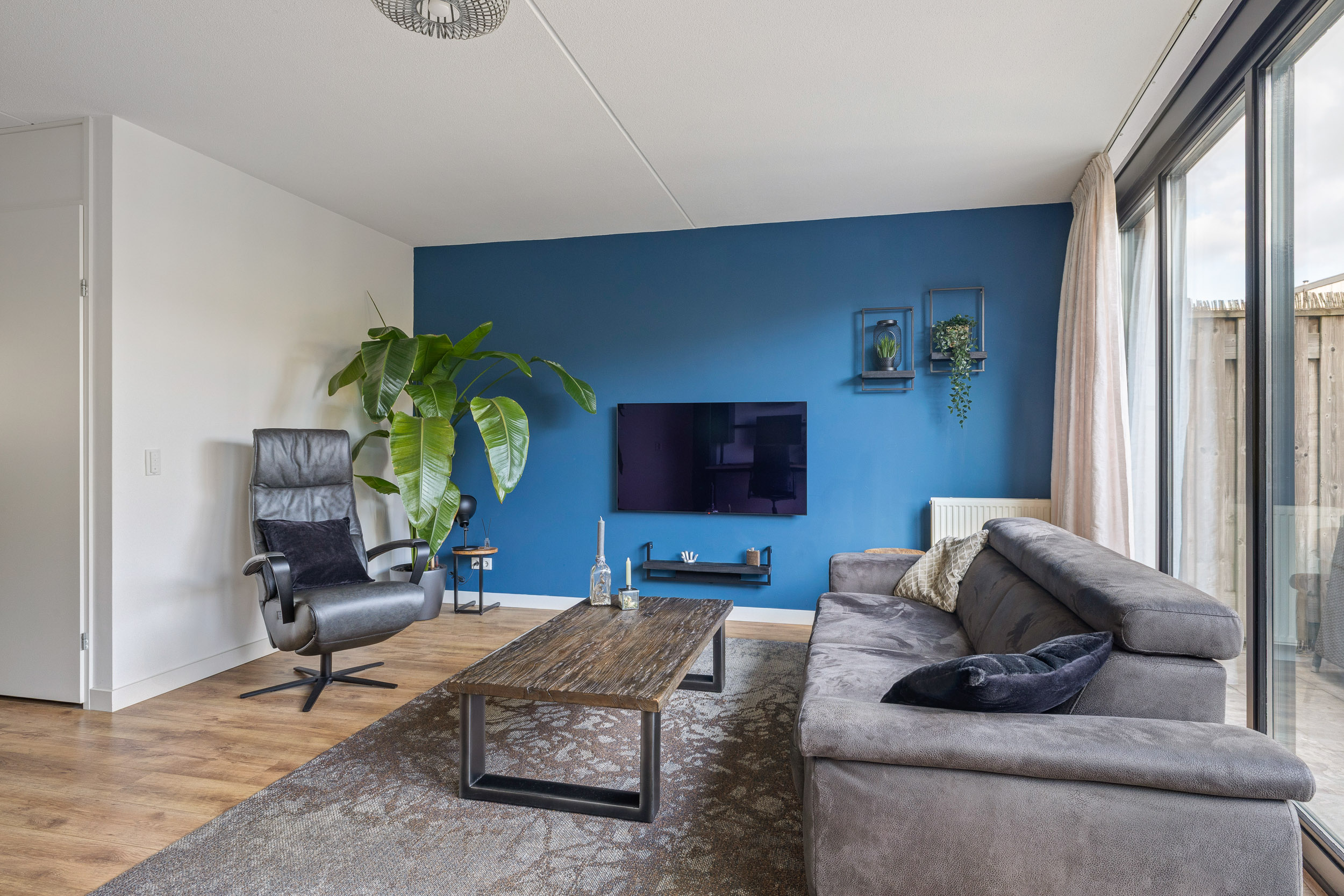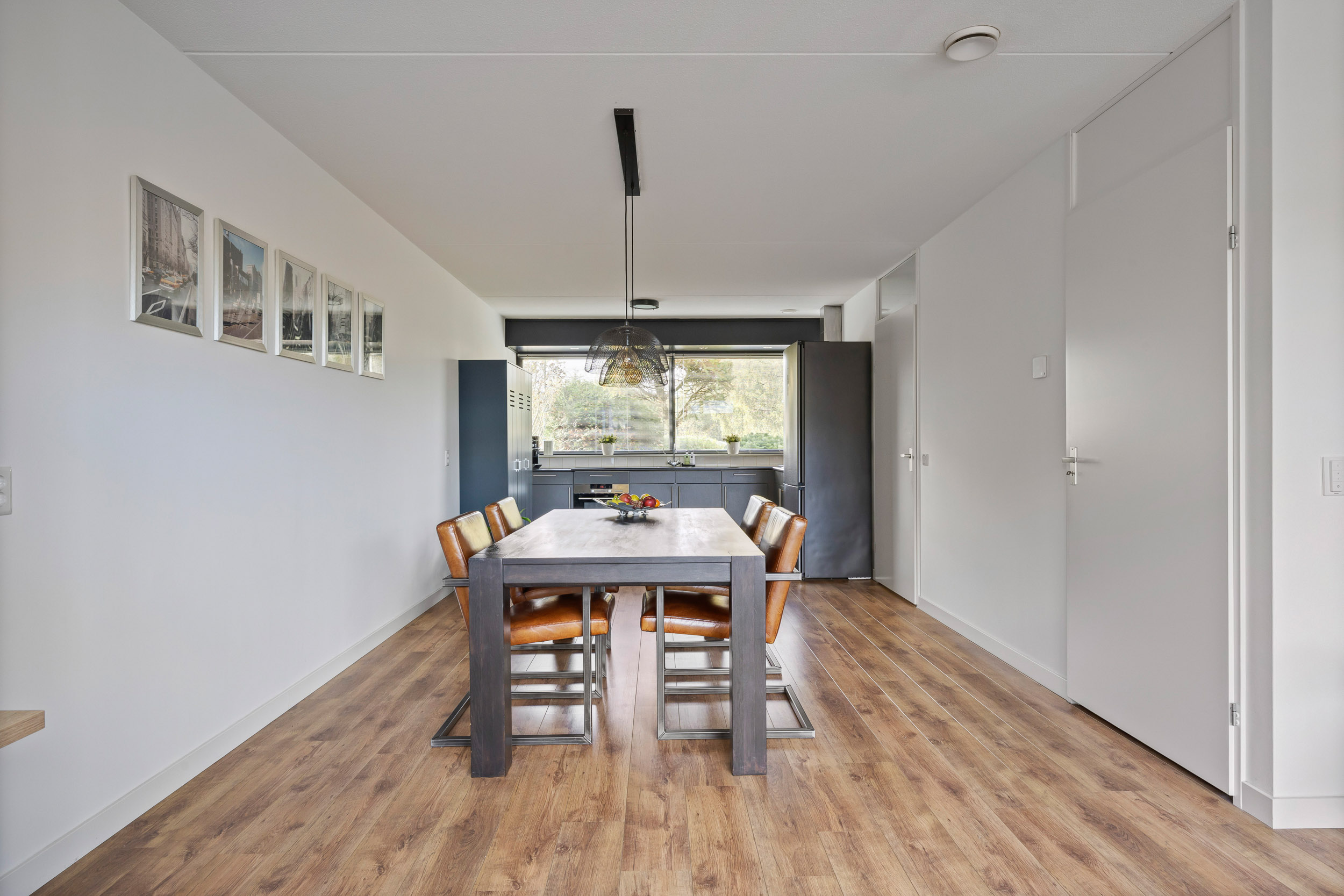 De woonkamer is opvallend licht en ruim, met de open keuken aan de voorzijde en de zithoek aan de achterzijde. De keuken is uitgevoerd in een moderne kleurstelling met grijze kastfronten en een antraciet werkblad. Voorzieningen zijn o.a. een inbouwoven, vaatwasser, 4-pits gasfornuis en afzuigkap. Dankzij de grote raampartijen aan zowel de voor- als achterzijde valt er veel daglicht binnen. Daarnaast ervaar je volop privacy door de geringe inkijk.