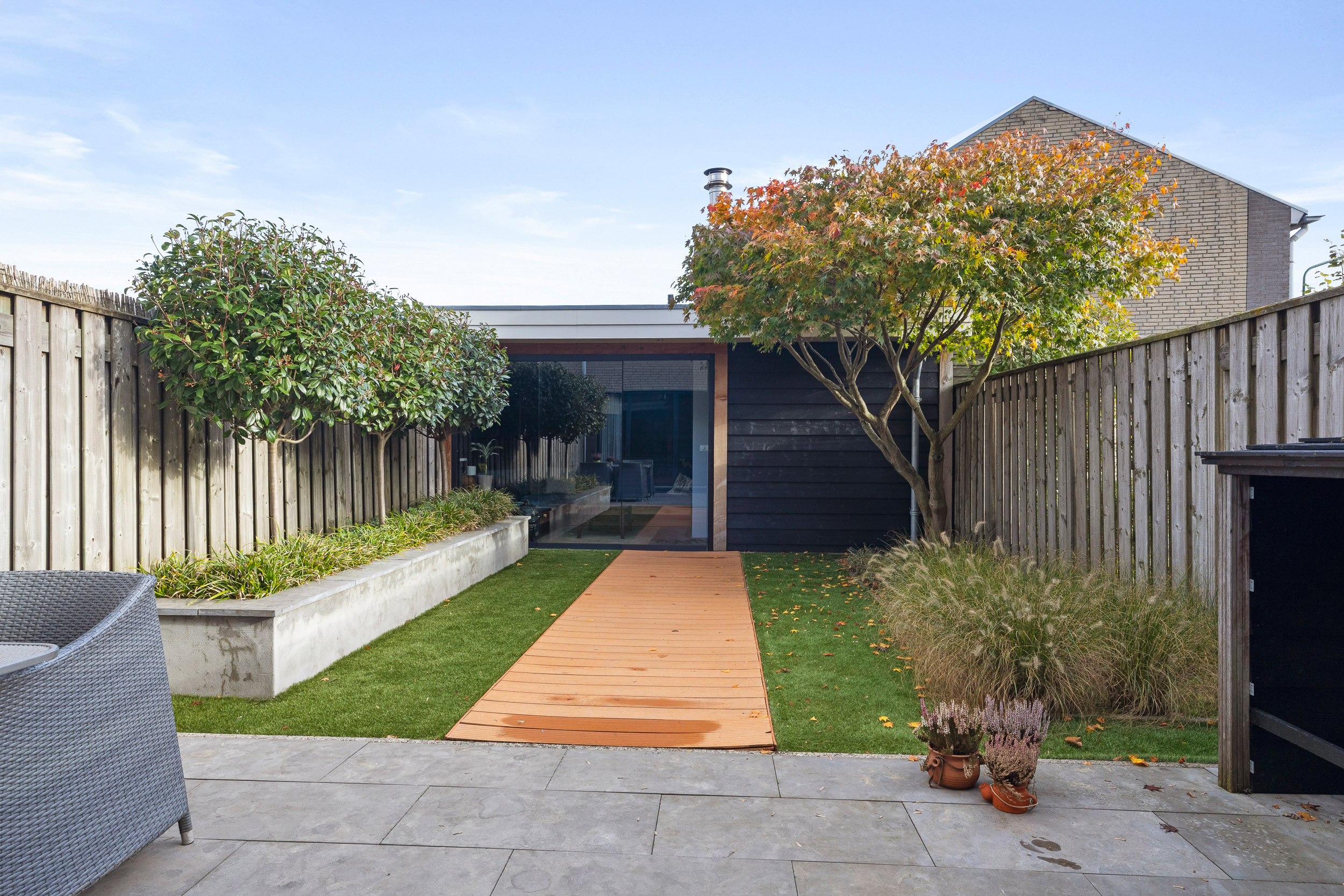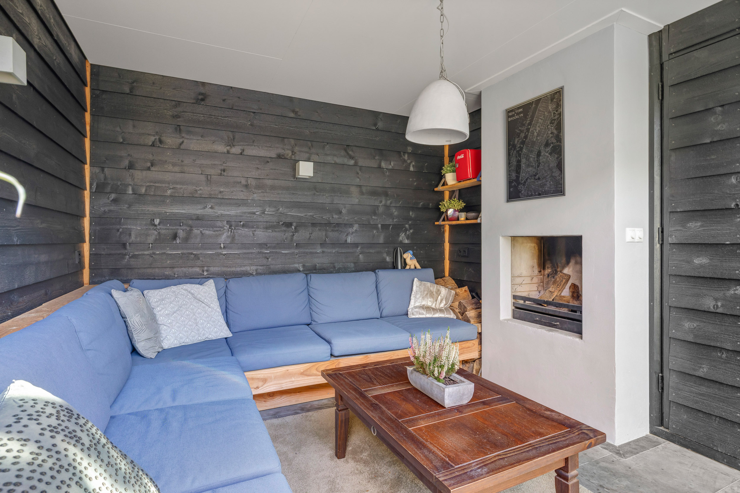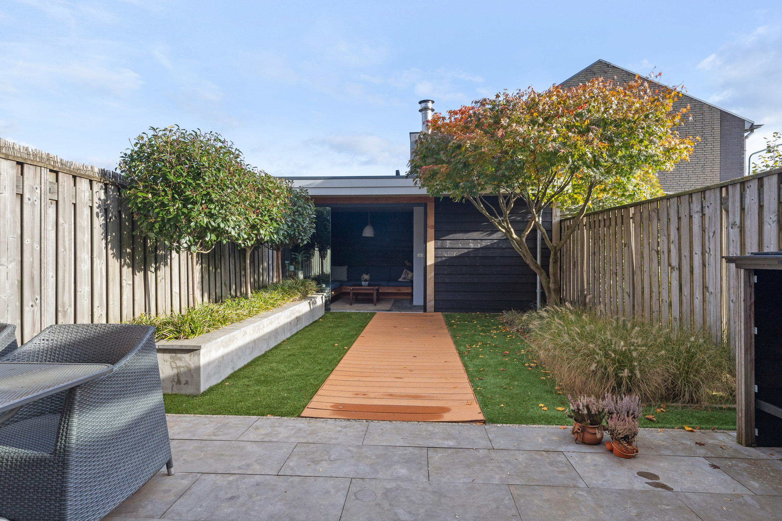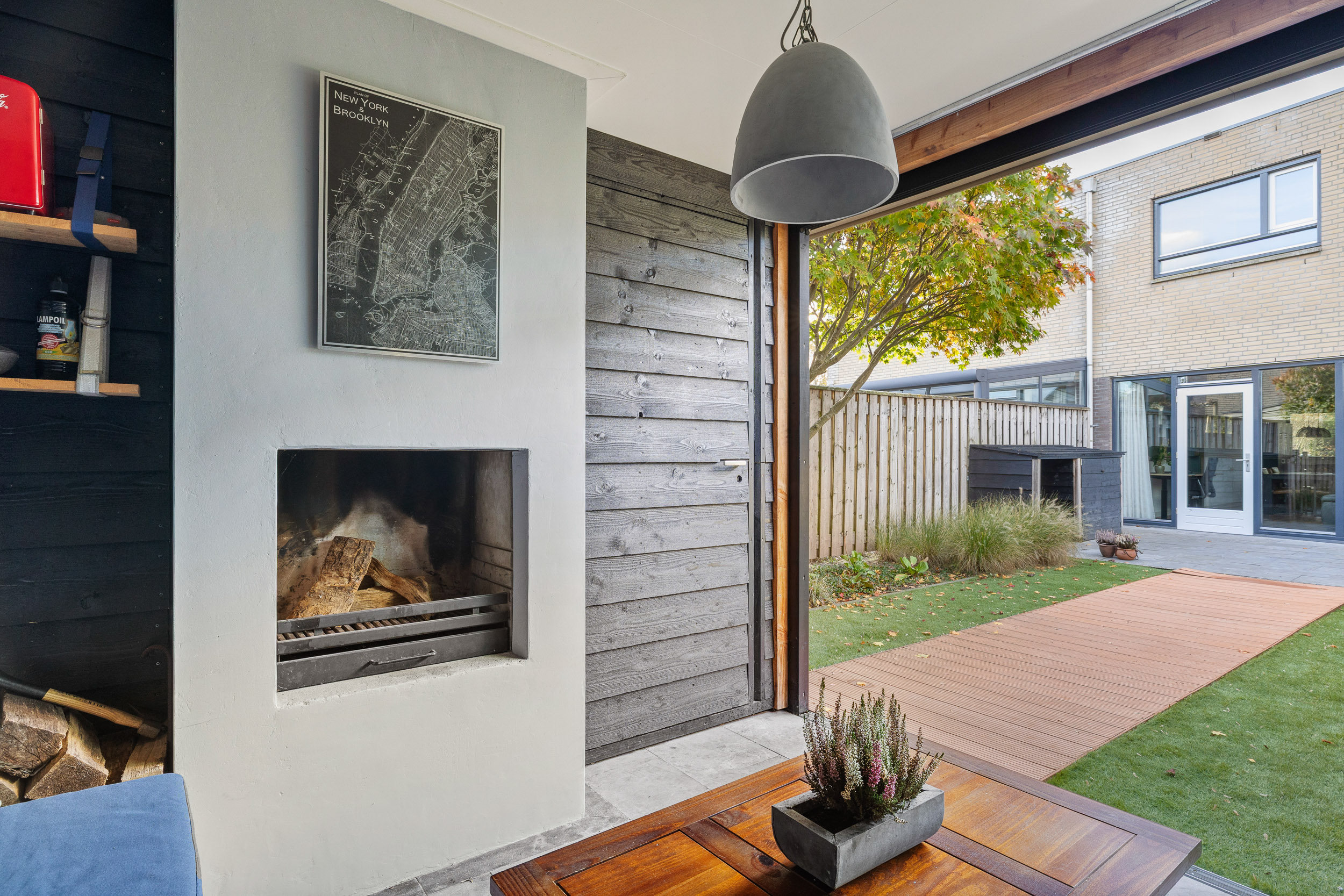 De onderhoudsvriendelijke achtertuin heeft een fijne zonligging, waardoor je hier de hele dag kunt genieten. Via de woonkamer stap je direct het terras op. Het composiet tuinpad leidt naar de prachtige douglas houten overkapping, voorzien van elektra en verlichting. Dankzij de open haard zit je hier ook op koudere dagen comfortabel. De glazen schuifwanden maken het mogelijk om de ruimte volledig af te sluiten, zodat je een sfeervolle tuinkamer creëert. De vaste hoekbank beschikt bovendien over praktische opbergruimte. Via een tussendeur bereik je de berging en van daaruit de brandgang.
