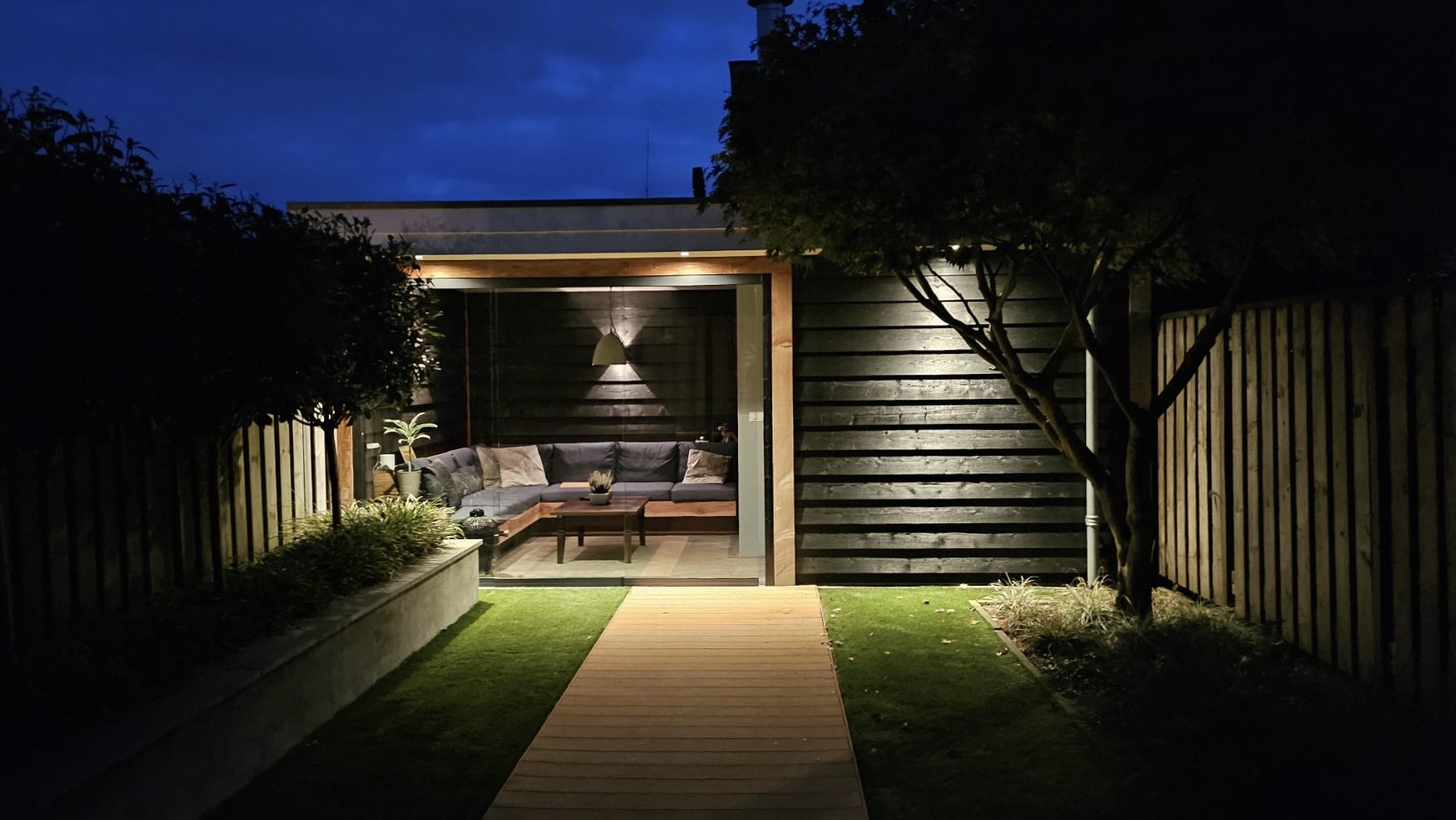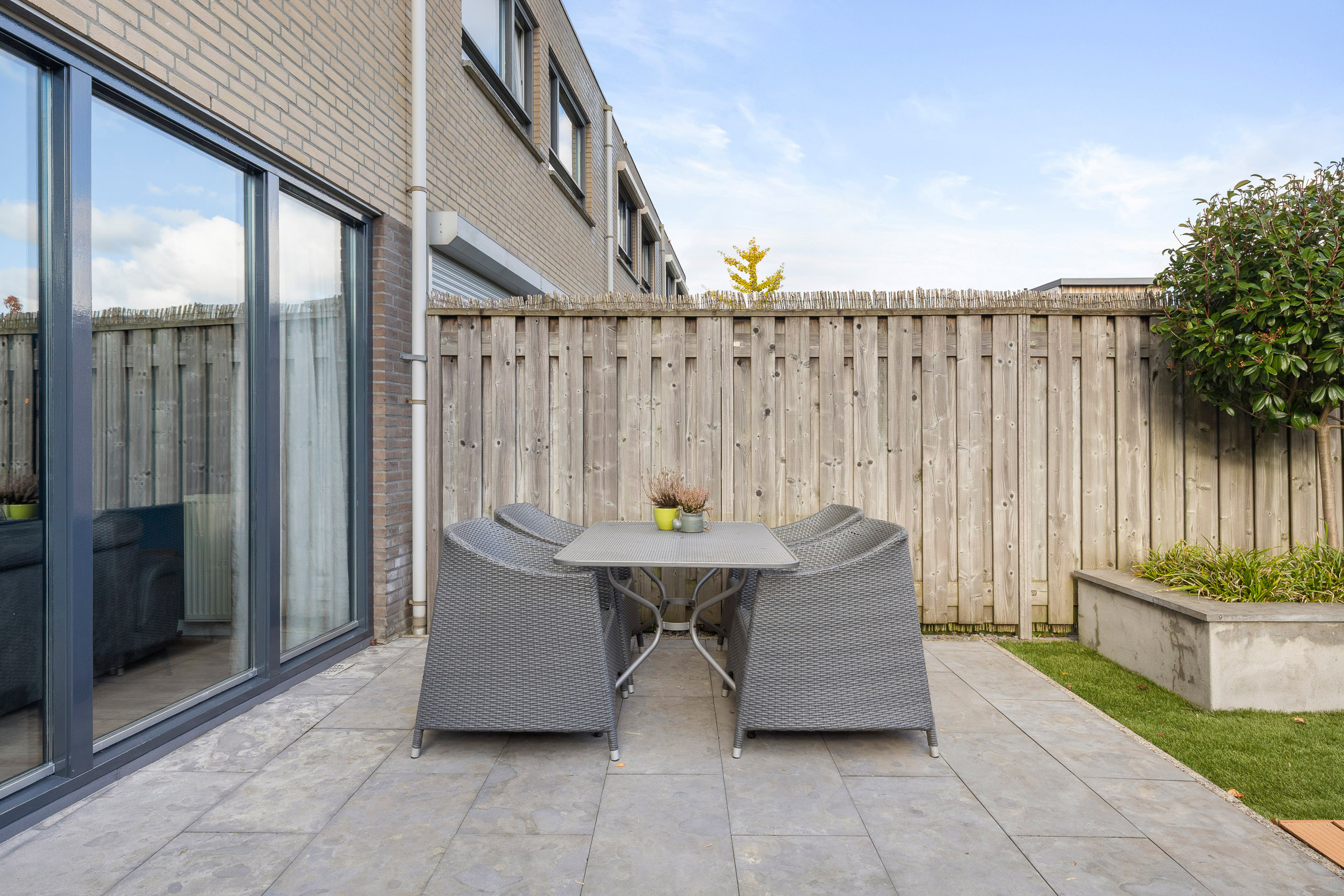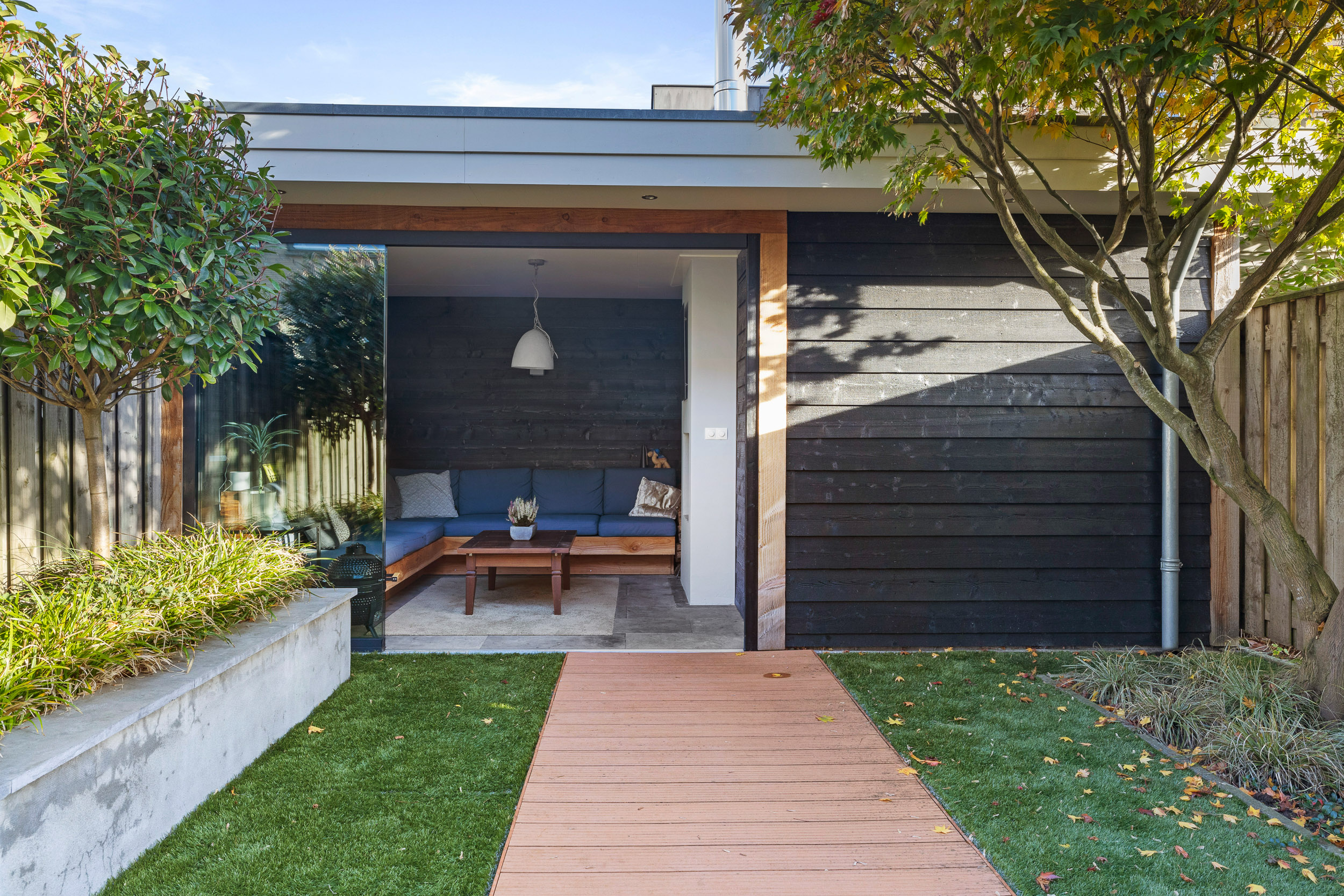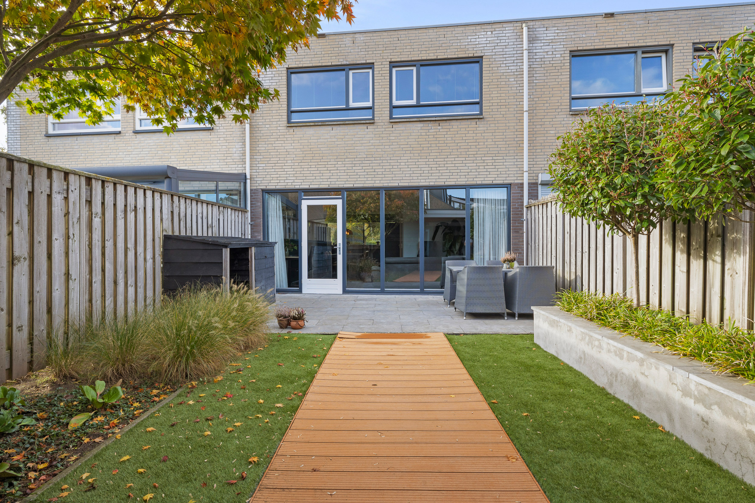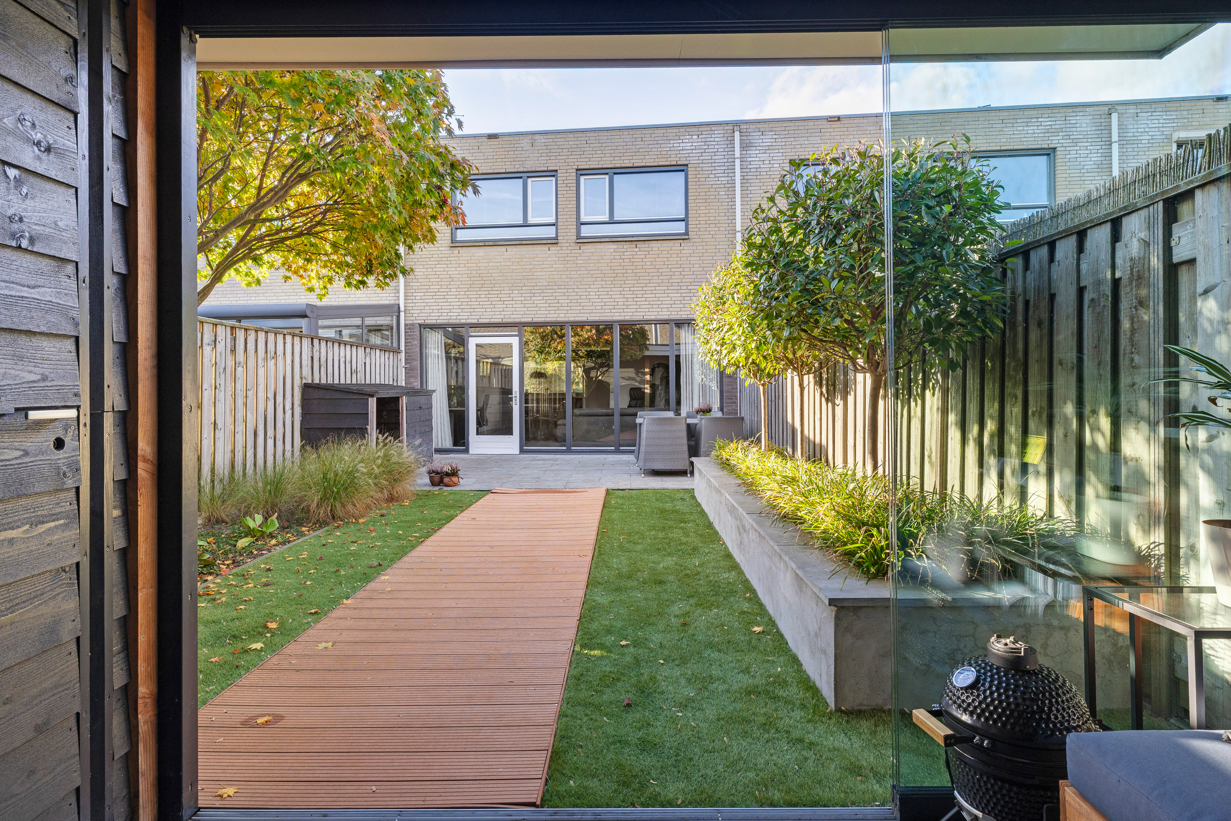 De onderhoudsvriendelijke achtertuin heeft een fijne zonligging, waardoor je hier de hele dag kunt genieten. Via de woonkamer stap je direct het terras op. Het composiet tuinpad leidt naar de prachtige douglas houten overkapping, voorzien van elektra en verlichting. Dankzij de open haard zit je hier ook op koudere dagen comfortabel. De glazen schuifwanden maken het mogelijk om de ruimte volledig af te sluiten, zodat je een sfeervolle tuinkamer creëert. De vaste hoekbank beschikt bovendien over praktische opbergruimte. Via een tussendeur bereik je de berging en van daaruit de brandgang.